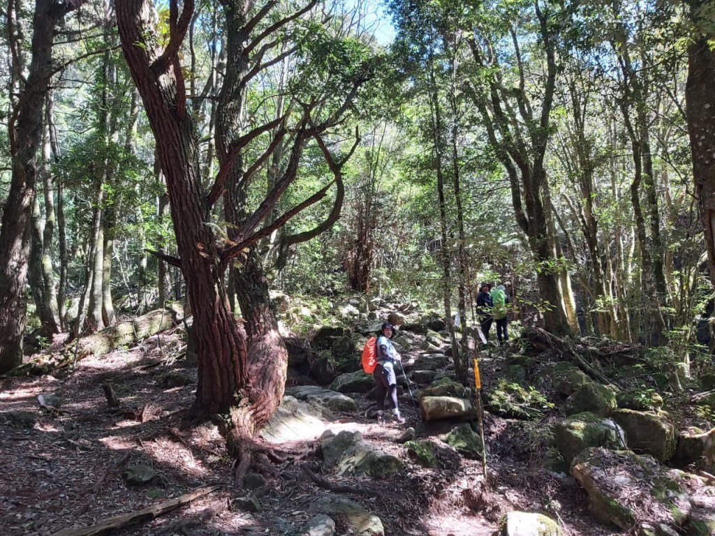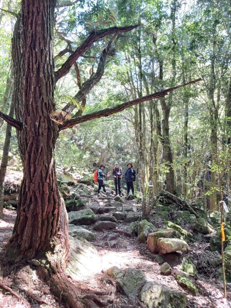 STH : 前段將近1k的踢馬路不論哪次都是痛苦的體驗,很可惜的是五星級的松針地毯消失了,前段的石子路不是很友善,走起來需要注意不要扭到腳踝。地形高低起伏松樹林很漂亮,還偷渡了巨石區的路線讓大家體驗,平坦的路段走起來很舒服,大家的體能也能跟上我偷偷的加速,讚,林中有看到不少巨木,可以感受到強韌的生命力。大家很喜歡犀牛 XD。美中不足的是沒時間去觀景平台與新山遺址。大小舜宇超可愛的,希望有機會能在山上遇到。 17:聽說是五星級步道,以為會比較輕鬆~NO NO!會排老二不是沒有原因,這座山好長?!而且第一次中間數度右小腿覺得想抽筋T^T最後的500公尺花了半小時,一直看不到盡頭~~啊!但真的很想要到三角點,所以一直努力撐下去,下山兩腳膝蓋都在痛了~ 以後午餐不要吃泡麵了,這次吃得很急,吃完就下山,胃都覺得痛了...冏 遇到揹著孩子上山的強人爸爸媽媽,麻麻說因為阿貝跟阿姨的鼓勵,她很開心也有自己走,沒有一直要抱抱。還約好可以去宜蘭找妹妹一起爬聖母山莊~希望妹妹可以等阿姨啊!S阿貝要記得揹妹妹上山哦