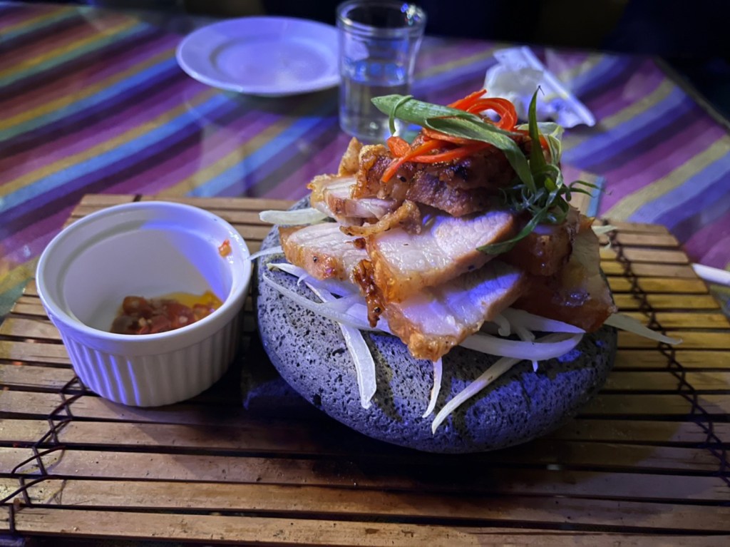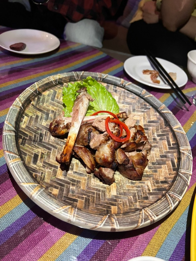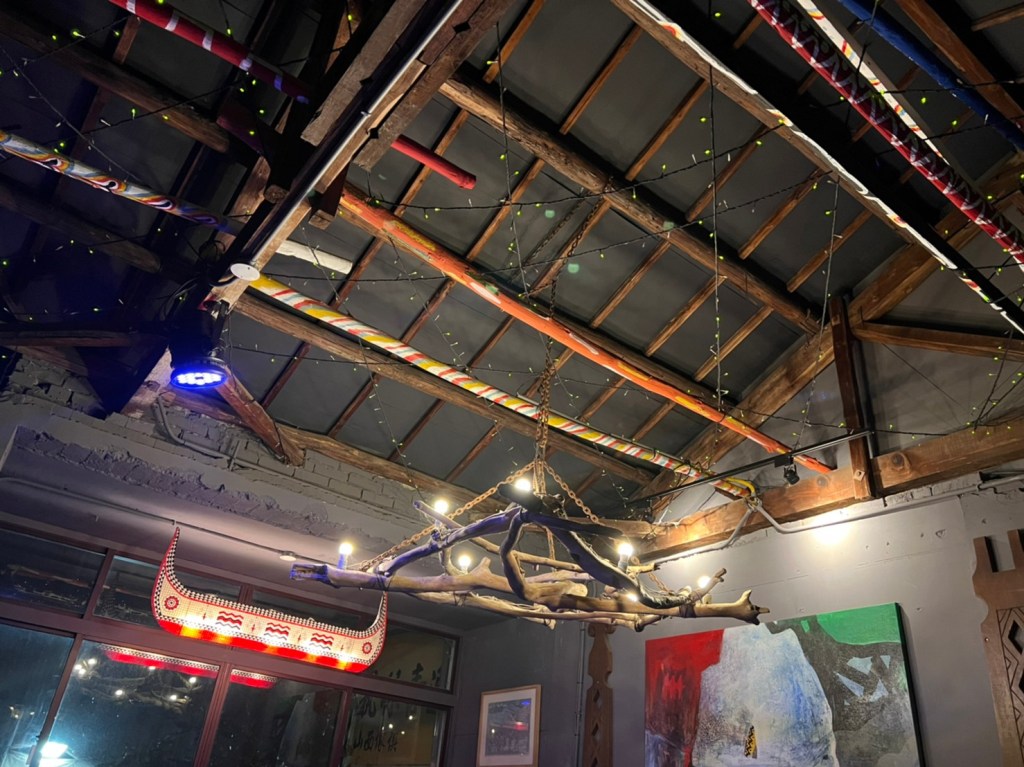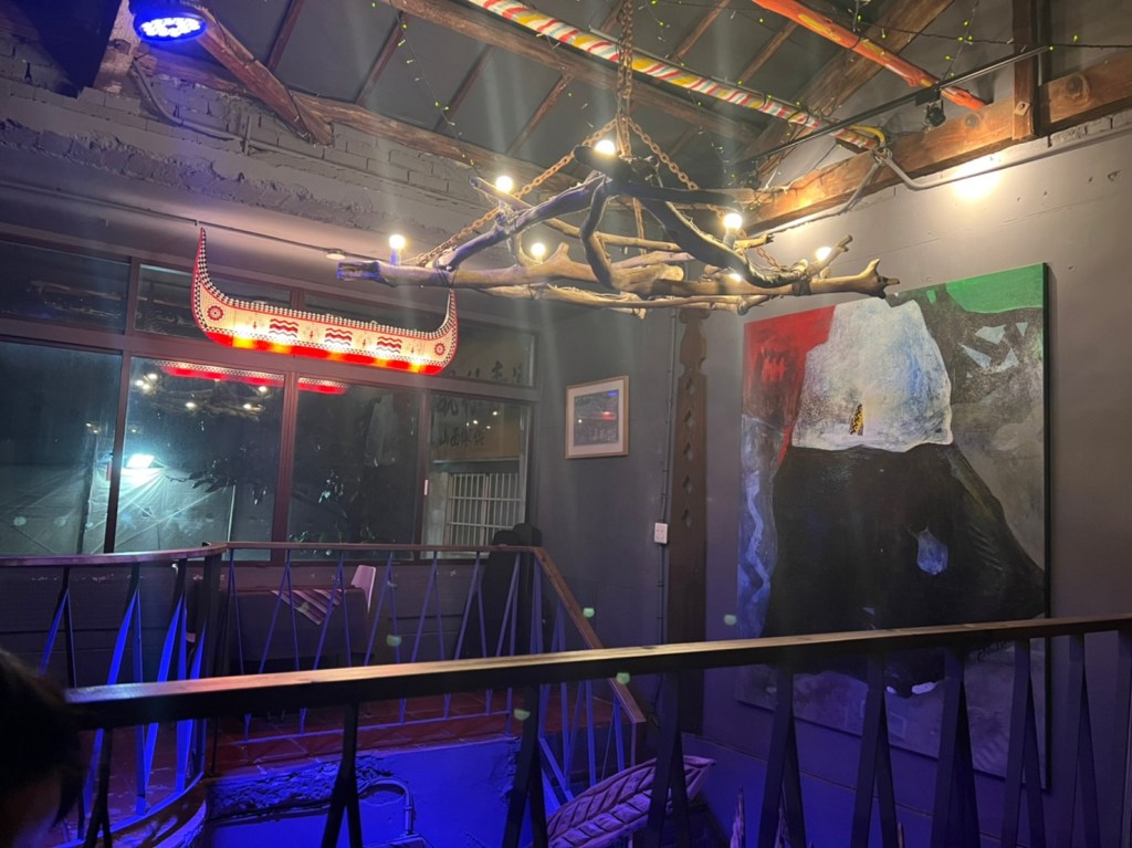 STH : 最有印樣的餐點是馬告香腸、炭烤山豬小腿肉、石板烤肉。馬告香腸超香的,在嘴裡散發的香味很馬告。石板烤肉很香,味道不錯,可惜外層酥皮太硬了,且肉質偏財柴很可惜,我的最愛是山豬小腿肉,調味適中不會無味也不會蓋過豬肉既有的味道,軟嫩適中口感很好,缺點是太少了。黃金豆腐其實也很好吃,但沒有配飯的話味道太重了,所以沒有入選前三。現場駐唱歌手的聲音不錯,流浪者這首歌聽到起雞皮疙瘩的動人,動感的歌曲也很能炒熱氣份,是個適合三五好友週五晚上吃飯離天的好去處。續攤的咖啡店也很有特色,老闆還教我不同泡法咖啡因的濃度差異,是個可以放鬆的空間。