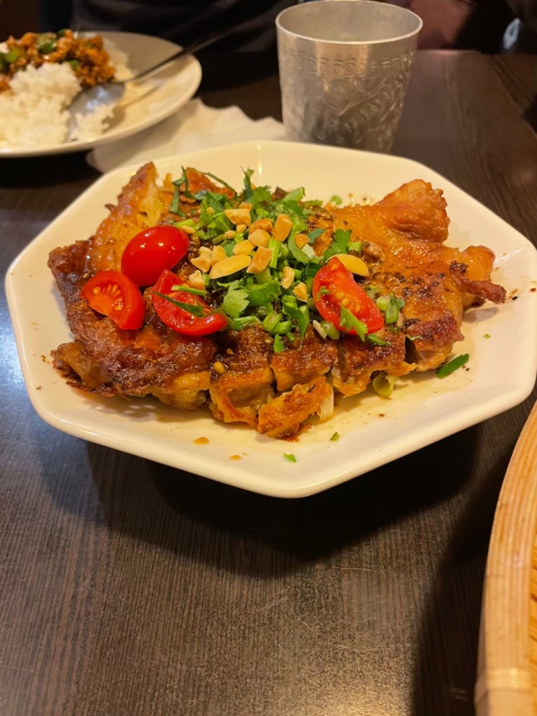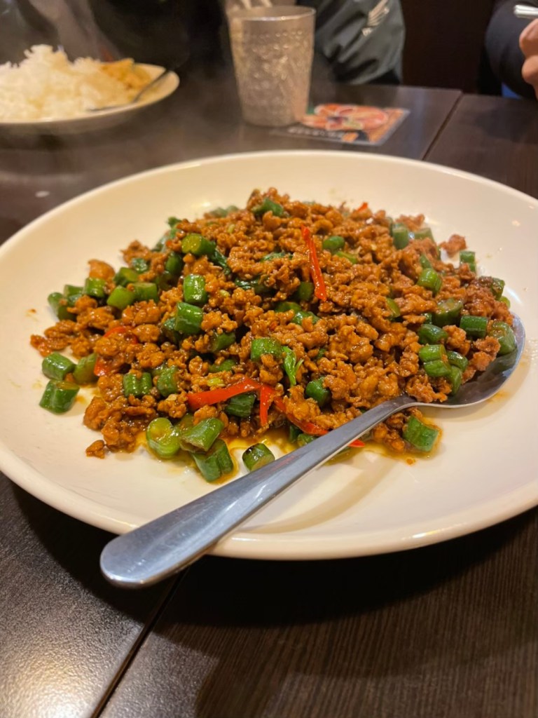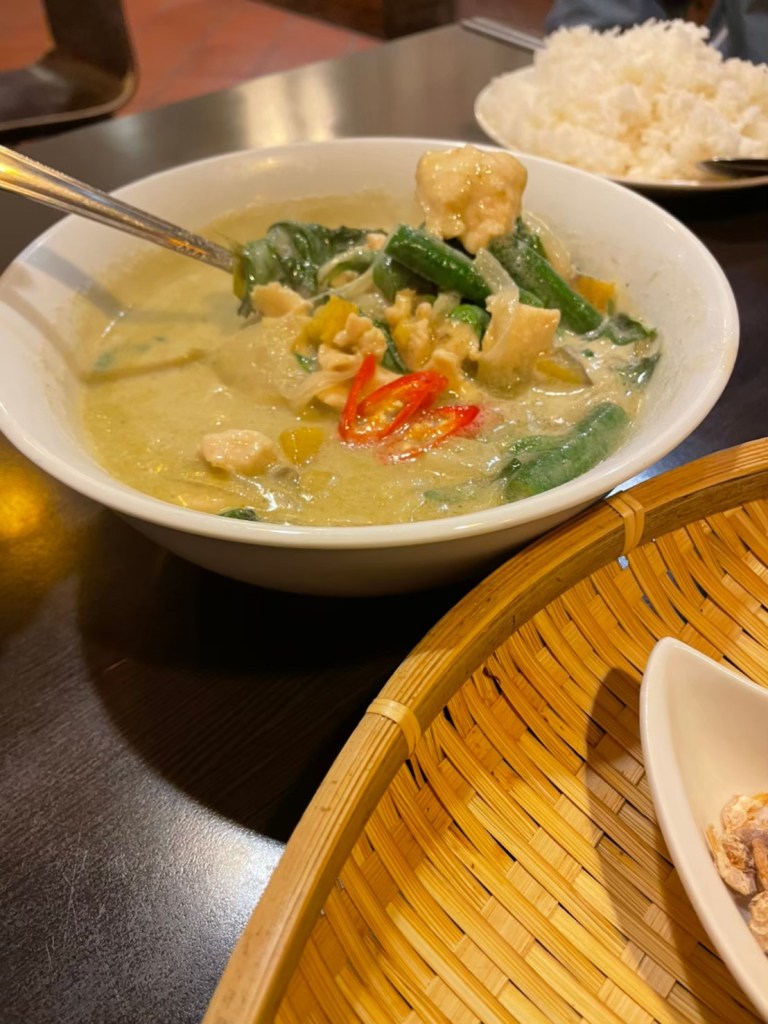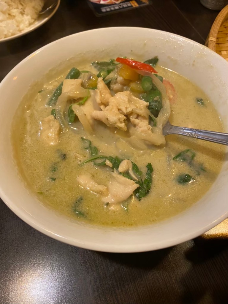 STH : 綠咖哩的奶香味非常獨特,不是一般奶油的味道,而且非常香,香到團員們都驚艷。椒麻雞酸、麻、辣,層次豐富不單調,打拋豬超下飯,鹹到剛剛好,不會吃多了膩嘴,月亮蝦餅也很豐厚,不會是一般乾癟,而是豐厚濕潤的蝦餅。團員們都說要再吃一次。 17 : 下山後的續攤、請店員加飯加了456次~究竟是餓到?還是好吃? 綠咖哩:椰奶味道比一般店家稍重 打拋豬:不死鹹(難道這就是狂加飯原因?!) 必點還有~椒麻雞、月亮蝦餅