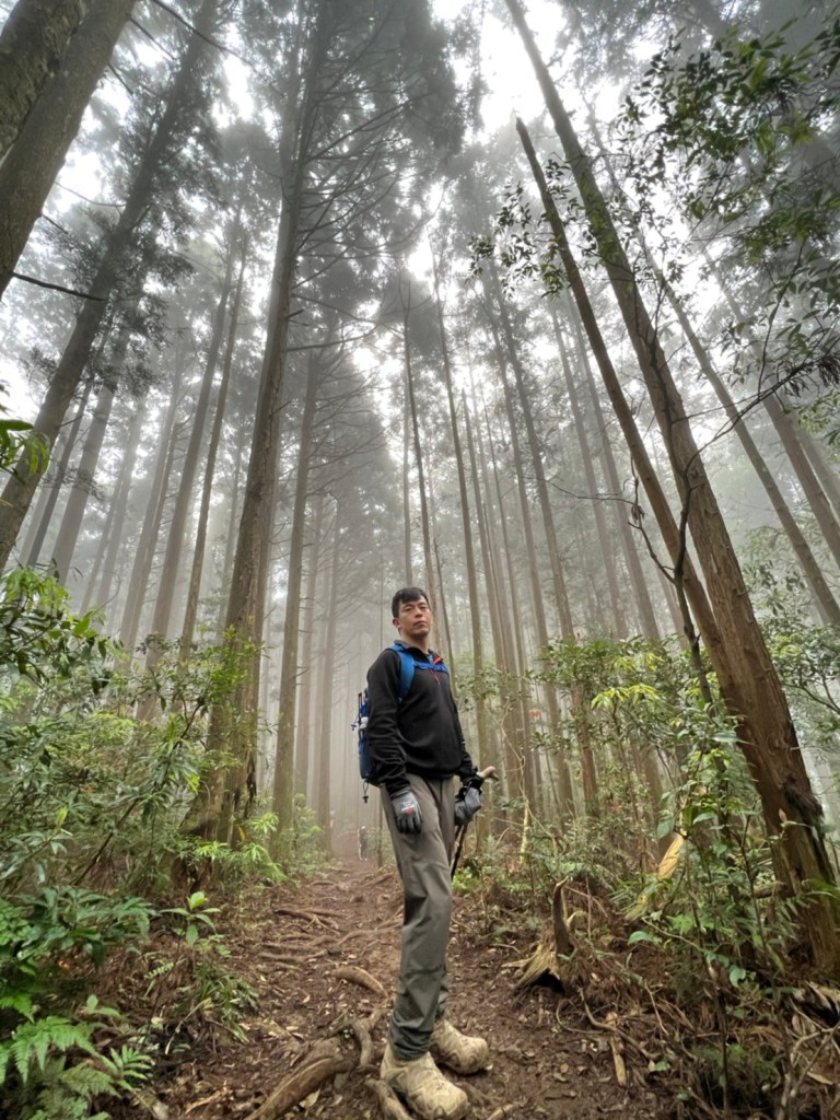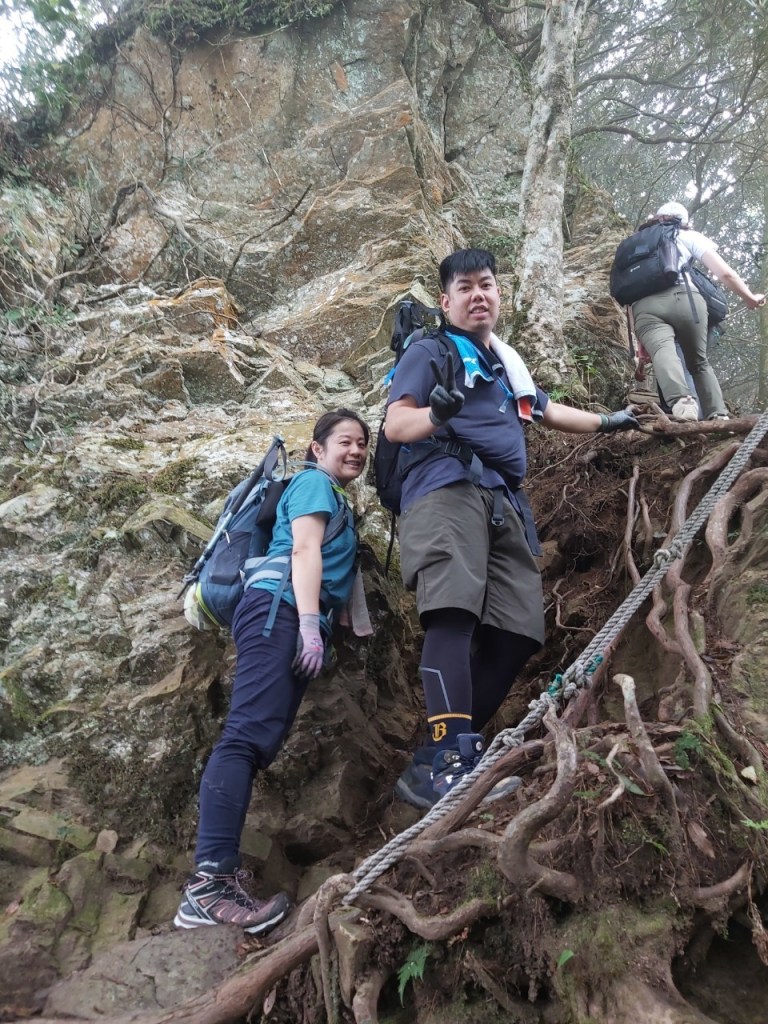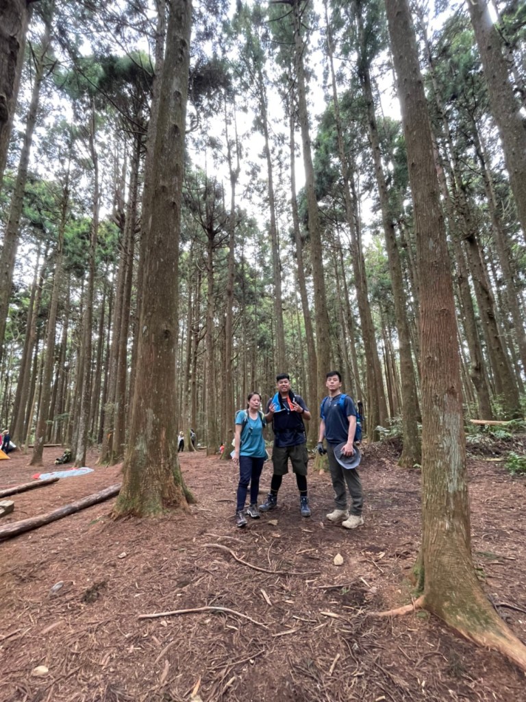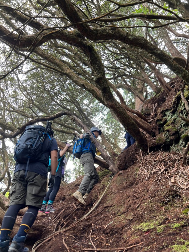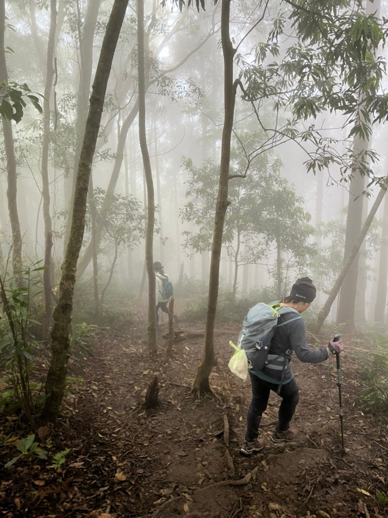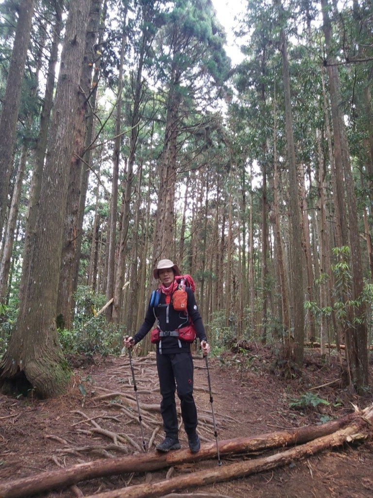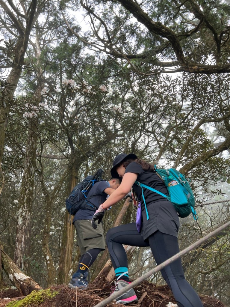 STH : 非常大眾化的路線,光看停靠的車輛,絕對破兩百人。前段前往高台山的陡上路線是個很不錯的熱身,但是因為人超多,跟著前方的人走走停停有點累,到了姑婆芋林的時候也沒有好的角度可以拍照,一直陡上直到林項改變進入柳杉人造林,路線開始好走,也能感受到心靈的放鬆,可惜今天沒有陽光可以拍攝光影,加上帳篷與人很多,為了移除雜物,適合拍照的地點不多。到達高台觀景台時也是人數眾多,大家排隊拍照,有個大叔還告訴我們,山上的白花是台灣種的杜鵑。沿途的樹木的姿態非常的多樣化,遇到了三顆很美麗的樹木,每顆都有自己的特色,但是需要仔細觀察,有的美景沒回頭是看不到的。我們走左上右下的P型路線,前往小島田的路線不算困難,但是明顯的,地面開始比較溼滑難走,前往中島田的路線很多攀爬路段,有的攀爬路線偏原始、有的布滿鬆軟的松針,每段攀爬都有著自己的特色,途中跟著前人走還迷路走到路線外側的植披,沒有拉繩、沒有樹枝可以拉,且越靠近大島田,路面就越濕,可能出發前幾天的雨勢引響,大家的鞋子褲管都髒髒的泥巴,路上也很難找到平坦地可以休息放飯。在大島田吃午餐是我們第一次使用地布野餐,看來大家都算蠻滿意的。回程的路段高低起伏但是屬於平坦,不會太難走。可能因為氣候使然,過午雲霧較重也較濕,氣溫也很明顯地降低,好險沒穿夏天的裝備,要不然真的會出事,但是雲霧繚繞的柳杉林很美,很值得。台灣不大,承佑遇到兩個認識的,而我們也在回到高台露營區時遇到約妹子的牛哥,只能說牛哥懂約。 17:從去年就一直看這條路線,終於成行了~感謝各位大大!CP值很高的一條路線,一次撿四座山,還讓你練手臂!確定成行時,這次有比較認真在找路線+看網路影片,對於一開始的陡上+近90度攀爬已有做好心理準備,但~陡上真的好累,而且還有一堆人在前在後,雖然自己的速度也不快,但也覺得前面人的速度忽快忽慢~想超車也卡卡。然後近90度的攀爬,怎麼會有趴2趴3…啊影片跟文章怎麼都沒說,害我一直覺得只有一段! 走了好久好久~~才到大島田山,有適合的空地放飯,今天勞煩S大大幫背午餐,但也不要像垃圾一樣掛在背包外面咩~這次準備了三顆自製飯糰+章魚小熱狗+芭樂,還有還有冰冰涼涼的「阿薩姆奶茶」<唯一缺點就是會想上廁所!> 當天天候狀況不是太好,去程就遇到開始起霧了,下山時更是走在山嵐之中,每個人都是仙女仙子,能見度超差~~且一心以為自己有帶頭灯,結果回家後隔了2、3天打開登山小箱箱才發現~欸!它躺在裡邊休息~還好在行走時尚可不用,不然就gg了! 下山的路雖然平緩許多,BUT一下爛泥巴、一下樹幹橫倒路中間,走起來也是無法加快速度~而且腳打滑溜滑梯了,還好有登山杖撐著,不然不知溜去哪了! 回程在露營區看到熟悉的背影,原來啊牛牛真的跑來這兒露營了,他們扛了好多罐啤酒上來,是想??