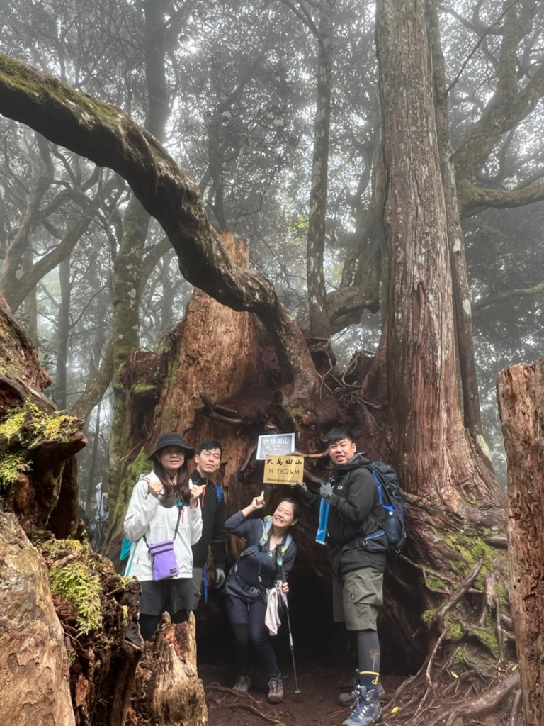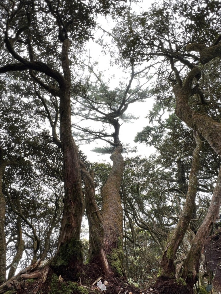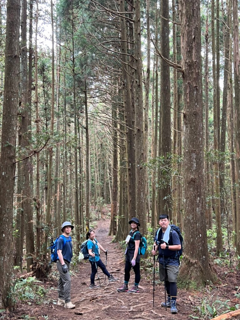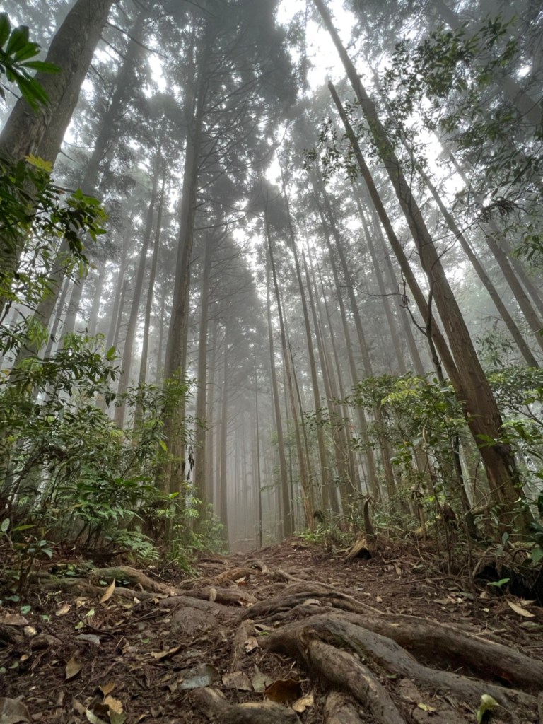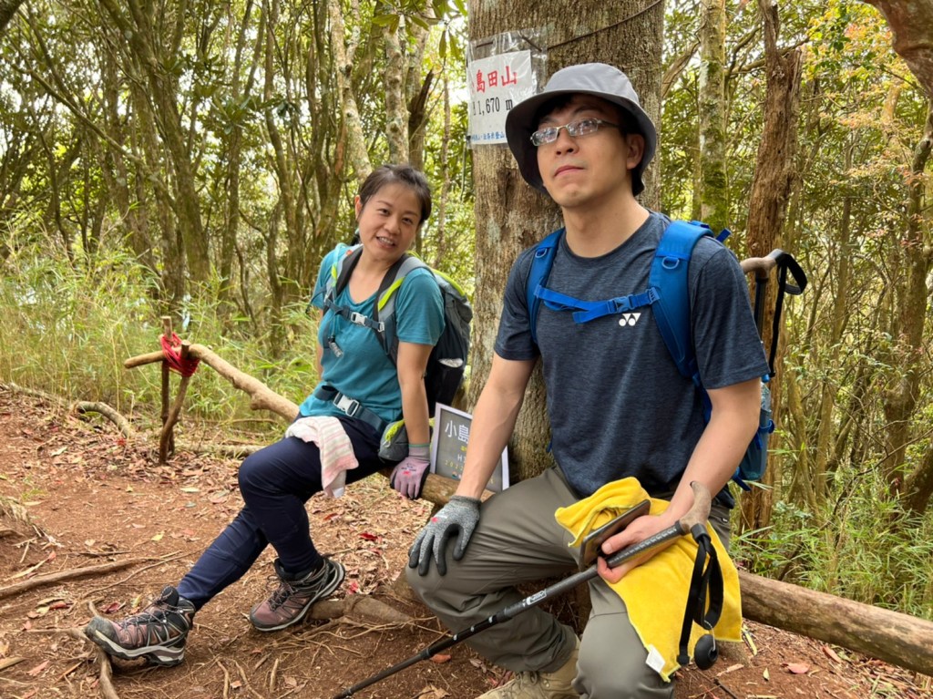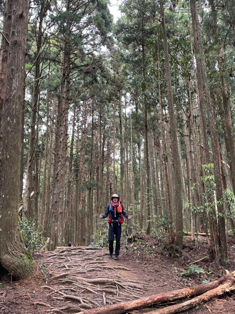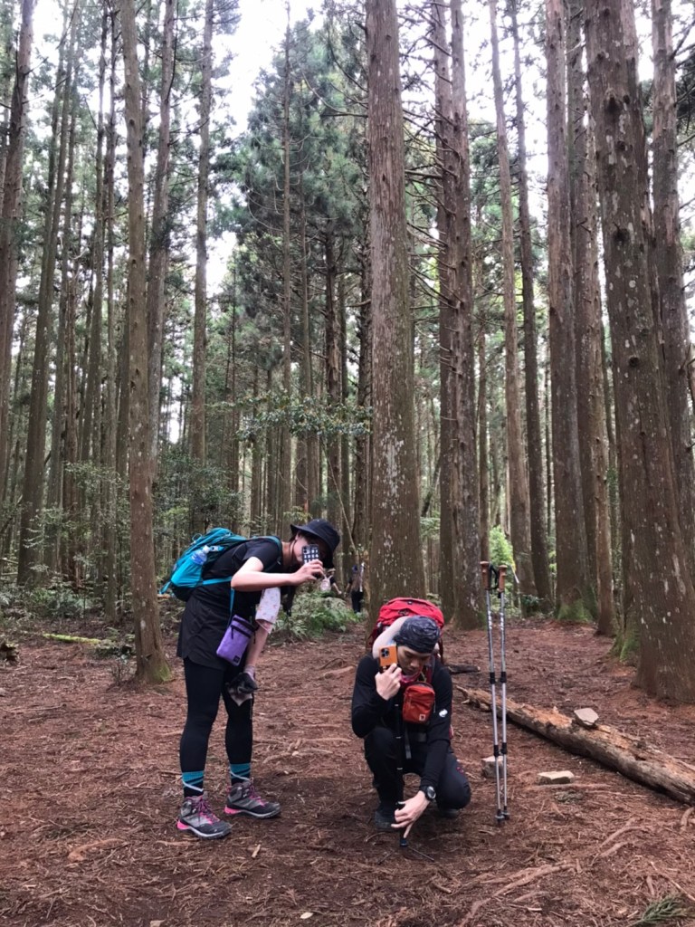 STH : 非常大眾化的路線,光看停靠的車輛,絕對破兩百人。前段前往高台山的陡上路線是個很不錯的熱身,但是因為人超多,跟著前方的人走走停停有點累,到了姑婆芋林的時候也沒有好的角度可以拍照,一直陡上直到林項改變進入柳杉人造林,路線開始好走,也能感受到心靈的放鬆,可惜今天沒有陽光可以拍攝光影,加上帳篷與人很多,為了移除雜物,適合拍照的地點不多。到達高台觀景台時也是人數眾多,大家排隊拍照,有個大叔還告訴我們,山上的白花是台灣種的杜鵑。沿途的樹木的姿態非常的多樣化,遇到了三顆很美麗的樹木,每顆都有自己的特色,但是需要仔細觀察,有的美景沒回頭是看不到的。我們走左上右下的P型路線,前往小島田的路線不算困難,但是明顯的,地面開始比較溼滑難走,前往中島田的路線很多攀爬路段,有的攀爬路線偏原始、有的布滿鬆軟的松針,每段攀爬都有著自己的特色,途中跟著前人走還迷路走到路線外側的植披,沒有拉繩、沒有樹枝可以拉,且越靠近大島田,路面就越濕,可能出發前幾天的雨勢引響,大家的鞋子褲管都髒髒的泥巴,路上也很難找到平坦地可以休息放飯。在大島田吃午餐是我們第一次使用地布野餐,看來大家都算蠻滿意的。回程的路段高低起伏但是屬於平坦,不會太難走。可能因為氣候使然,過午雲霧較重也較濕,氣溫也很明顯地降低,好險沒穿夏天的裝備,要不然真的會出事,但是雲霧繚繞的柳杉林很美,很值得。台灣不大,承佑遇到兩個認識的,而我們也在回到高台露營區時遇到約妹子的牛哥,只能說牛哥懂約。 17:從去年就一直看這條路線,終於成行了~感謝各位大大!CP值很高的一條路線,一次撿四座山,還讓你練手臂!確定成行時,這次有比較認真在找路線+看網路影片,對於一開始的陡上+近90度攀爬已有做好心理準備,但~陡上真的好累,而且還有一堆人在前在後,雖然自己的速度也不快,但也覺得前面人的速度忽快忽慢~想超車也卡卡。然後近90度的攀爬,怎麼會有趴2趴3…啊影片跟文章怎麼都沒說,害我一直覺得只有一段! 走了好久好久~~才到大島田山,有適合的空地放飯,今天勞煩S大大幫背午餐,但也不要像垃圾一樣掛在背包外面咩~這次準備了三顆自製飯糰+章魚小熱狗+芭樂,還有還有冰冰涼涼的「阿薩姆奶茶」<唯一缺點就是會想上廁所!> 當天天候狀況不是太好,去程就遇到開始起霧了,下山時更是走在山嵐之中,每個人都是仙女仙子,能見度超差~~且一心以為自己有帶頭灯,結果回家後隔了2、3天打開登山小箱箱才發現~欸!它躺在裡邊休息~還好在行走時尚可不用,不然就gg了! 下山的路雖然平緩許多,BUT一下爛泥巴、一下樹幹橫倒路中間,走起來也是無法加快速度~而且腳打滑溜滑梯了,還好有登山杖撐著,不然不知溜去哪了! 回程在露營區看到熟悉的背影,原來啊牛牛真的跑來這兒露營了,他們扛了好多罐啤酒上來,是想??