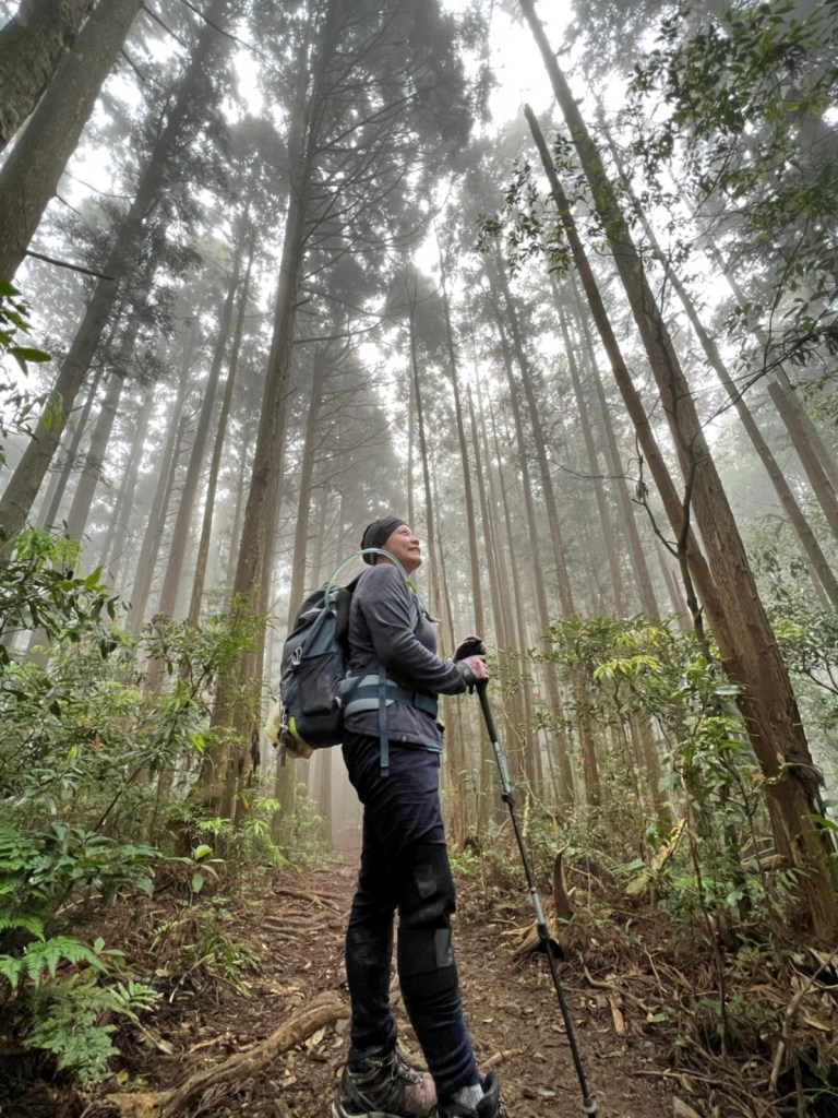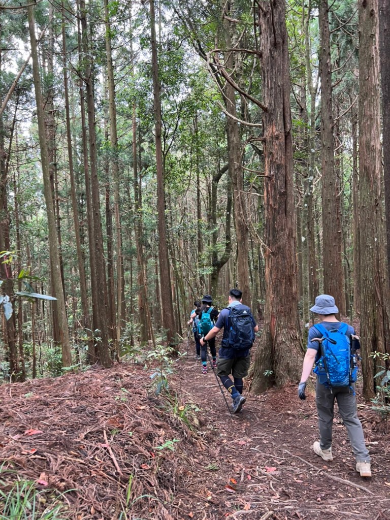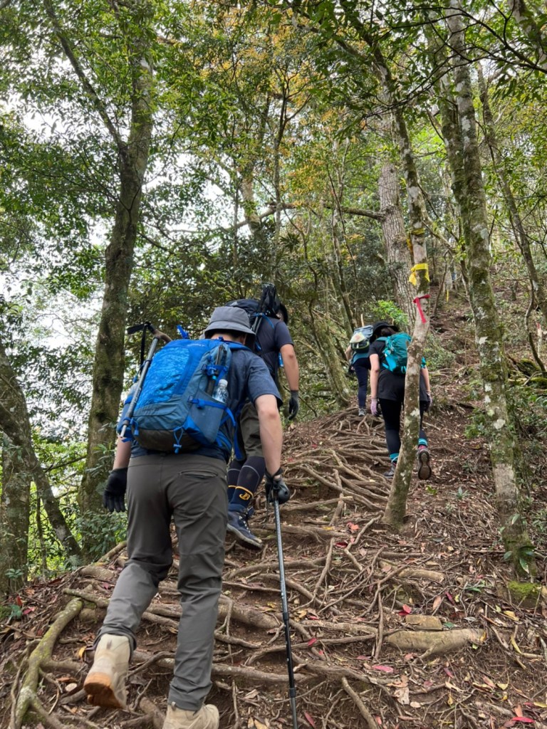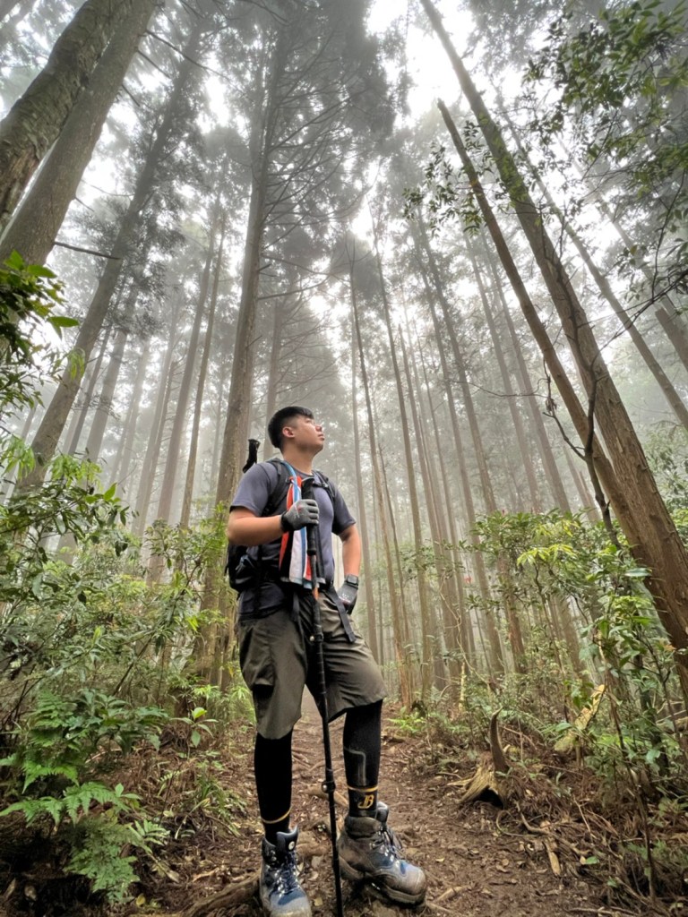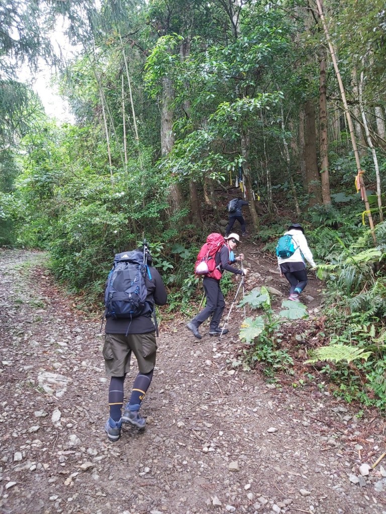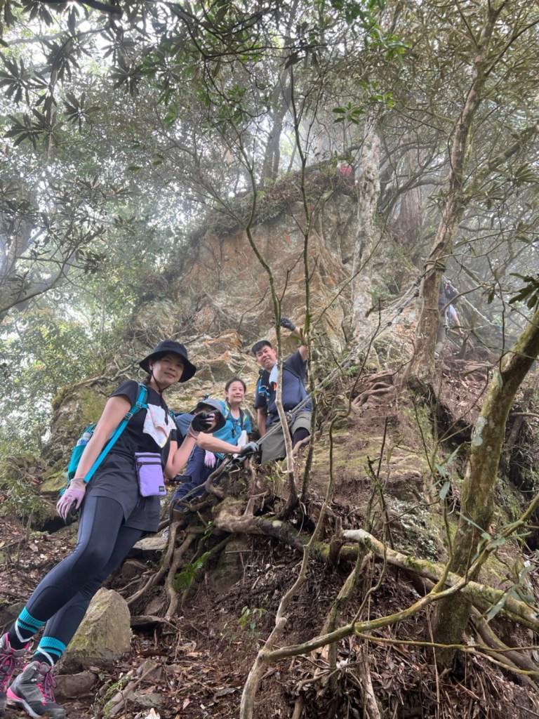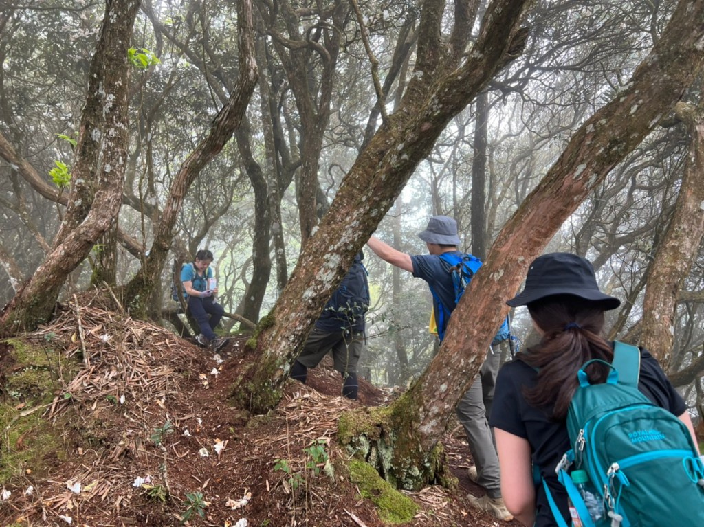 STH : 非常大眾化的路線,光看停靠的車輛,絕對破兩百人。前段前往高台山的陡上路線是個很不錯的熱身,但是因為人超多,跟著前方的人走走停停有點累,到了姑婆芋林的時候也沒有好的角度可以拍照,一直陡上直到林項改變進入柳杉人造林,路線開始好走,也能感受到心靈的放鬆,可惜今天沒有陽光可以拍攝光影,加上帳篷與人很多,為了移除雜物,適合拍照的地點不多。到達高台觀景台時也是人數眾多,大家排隊拍照,有個大叔還告訴我們,山上的白花是台灣種的杜鵑。沿途的樹木的姿態非常的多樣化,遇到了三顆很美麗的樹木,每顆都有自己的特色,但是需要仔細觀察,有的美景沒回頭是看不到的。我們走左上右下的P型路線,前往小島田的路線不算困難,但是明顯的,地面開始比較溼滑難走,前往中島田的路線很多攀爬路段,有的攀爬路線偏原始、有的布滿鬆軟的松針,每段攀爬都有著自己的特色,途中跟著前人走還迷路走到路線外側的植披,沒有拉繩、沒有樹枝可以拉,且越靠近大島田,路面就越濕,可能出發前幾天的雨勢引響,大家的鞋子褲管都髒髒的泥巴,路上也很難找到平坦地可以休息放飯。在大島田吃午餐是我們第一次使用地布野餐,看來大家都算蠻滿意的。回程的路段高低起伏但是屬於平坦,不會太難走。可能因為氣候使然,過午雲霧較重也較濕,氣溫也很明顯地降低,好險沒穿夏天的裝備,要不然真的會出事,但是雲霧繚繞的柳杉林很美,很值得。台灣不大,承佑遇到兩個認識的,而我們也在回到高台露營區時遇到約妹子的牛哥,只能說牛哥懂約。 17:從去年就一直看這條路線,終於成行了~感謝各位大大!CP值很高的一條路線,一次撿四座山,還讓你練手臂!確定成行時,這次有比較認真在找路線+看網路影片,對於一開始的陡上+近90度攀爬已有做好心理準備,但~陡上真的好累,而且還有一堆人在前在後,雖然自己的速度也不快,但也覺得前面人的速度忽快忽慢~想超車也卡卡。然後近90度的攀爬,怎麼會有趴2趴3…啊影片跟文章怎麼都沒說,害我一直覺得只有一段! 走了好久好久~~才到大島田山,有適合的空地放飯,今天勞煩S大大幫背午餐,但也不要像垃圾一樣掛在背包外面咩~這次準備了三顆自製飯糰+章魚小熱狗+芭樂,還有還有冰冰涼涼的「阿薩姆奶茶」<唯一缺點就是會想上廁所!> 當天天候狀況不是太好,去程就遇到開始起霧了,下山時更是走在山嵐之中,每個人都是仙女仙子,能見度超差~~且一心以為自己有帶頭灯,結果回家後隔了2、3天打開登山小箱箱才發現~欸!它躺在裡邊休息~還好在行走時尚可不用,不然就gg了! 下山的路雖然平緩許多,BUT一下爛泥巴、一下樹幹橫倒路中間,走起來也是無法加快速度~而且腳打滑溜滑梯了,還好有登山杖撐著,不然不知溜去哪了! 回程在露營區看到熟悉的背影,原來啊牛牛真的跑來這兒露營了,他們扛了好多罐啤酒上來,是想??