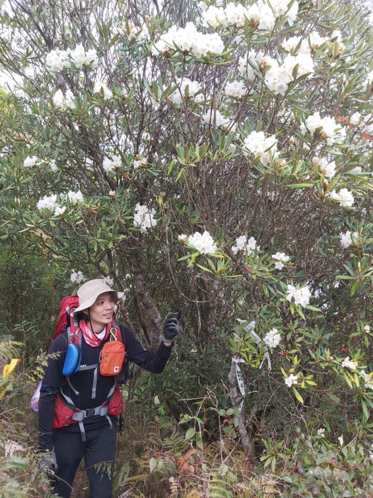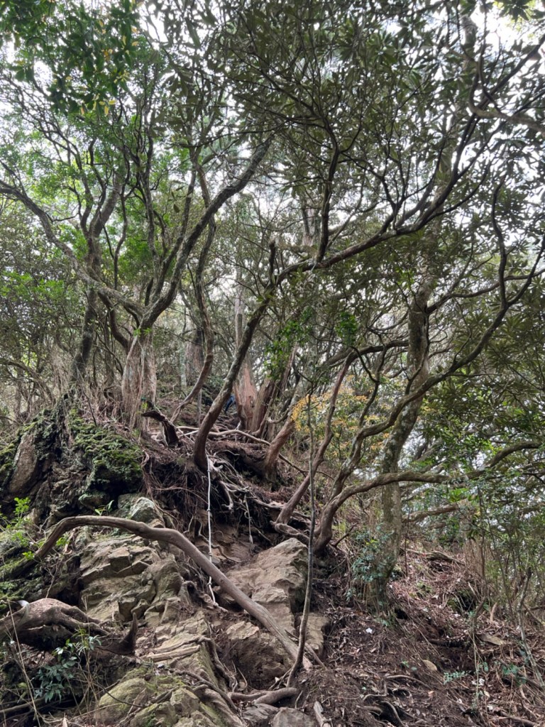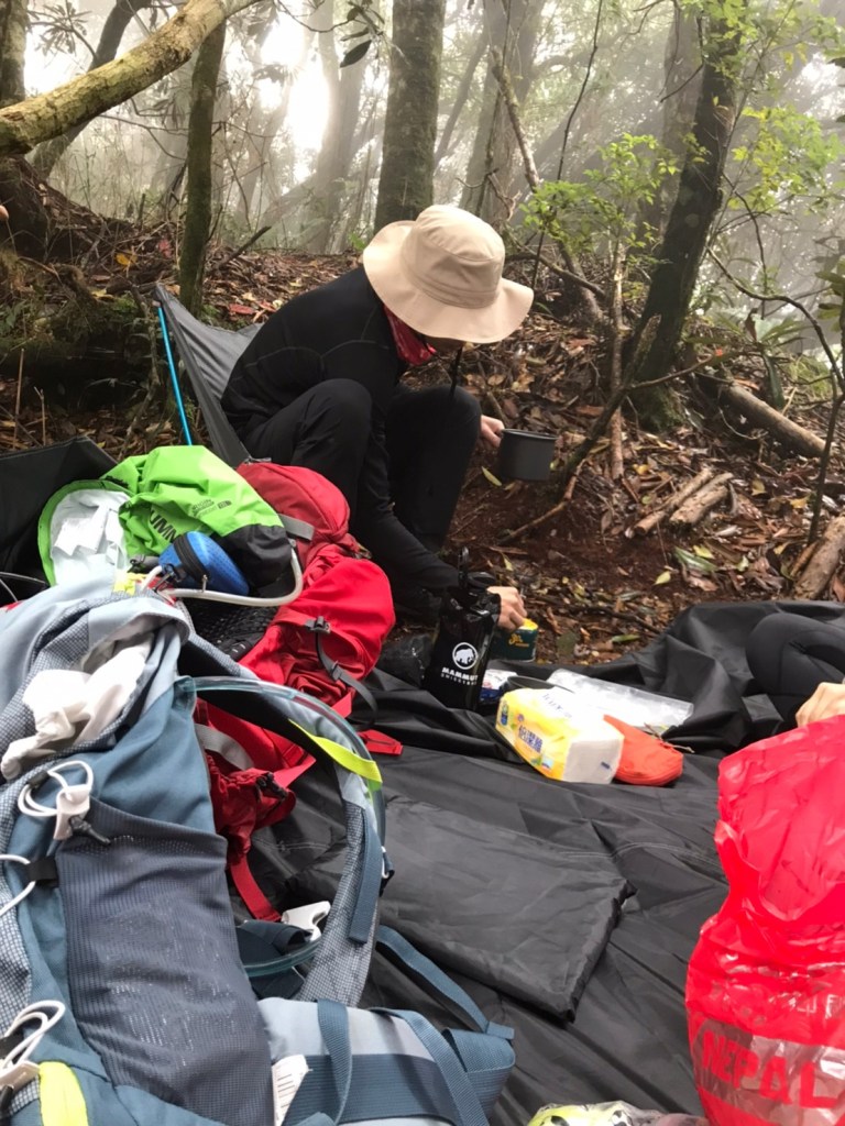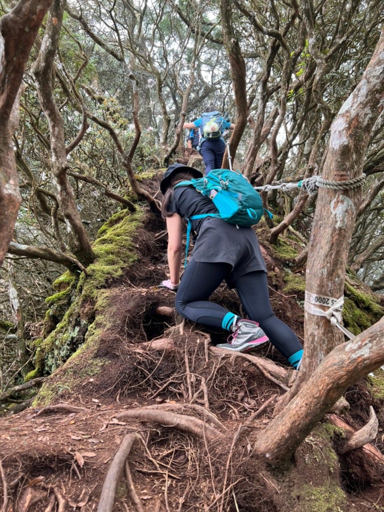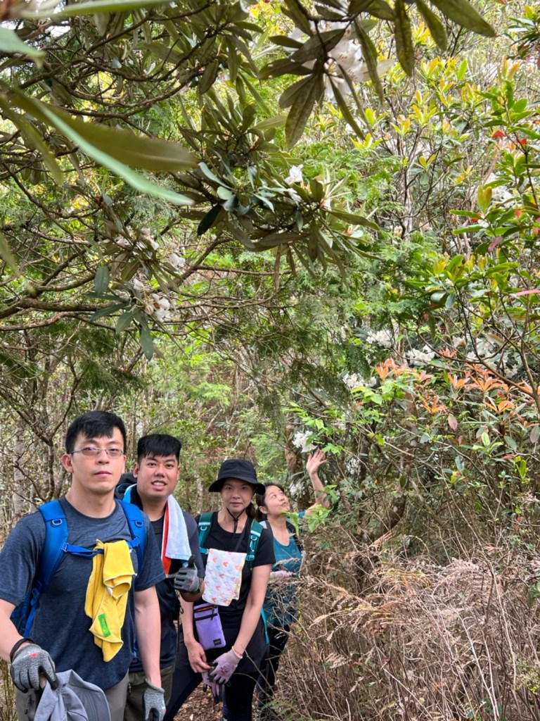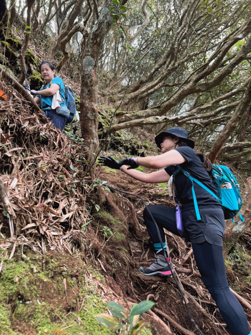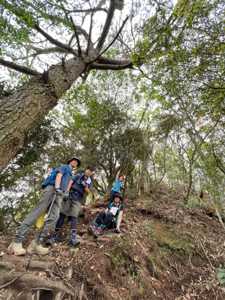 STH : 非常大眾化的路線,光看停靠的車輛,絕對破兩百人。前段前往高台山的陡上路線是個很不錯的熱身,但是因為人超多,跟著前方的人走走停停有點累,到了姑婆芋林的時候也沒有好的角度可以拍照,一直陡上直到林項改變進入柳杉人造林,路線開始好走,也能感受到心靈的放鬆,可惜今天沒有陽光可以拍攝光影,加上帳篷與人很多,為了移除雜物,適合拍照的地點不多。到達高台觀景台時也是人數眾多,大家排隊拍照,有個大叔還告訴我們,山上的白花是台灣種的杜鵑。沿途的樹木的姿態非常的多樣化,遇到了三顆很美麗的樹木,每顆都有自己的特色,但是需要仔細觀察,有的美景沒回頭是看不到的。我們走左上右下的P型路線,前往小島田的路線不算困難,但是明顯的,地面開始比較溼滑難走,前往中島田的路線很多攀爬路段,有的攀爬路線偏原始、有的布滿鬆軟的松針,每段攀爬都有著自己的特色,途中跟著前人走還迷路走到路線外側的植披,沒有拉繩、沒有樹枝可以拉,且越靠近大島田,路面就越濕,可能出發前幾天的雨勢引響,大家的鞋子褲管都髒髒的泥巴,路上也很難找到平坦地可以休息放飯。在大島田吃午餐是我們第一次使用地布野餐,看來大家都算蠻滿意的。回程的路段高低起伏但是屬於平坦,不會太難走。可能因為氣候使然,過午雲霧較重也較濕,氣溫也很明顯地降低,好險沒穿夏天的裝備,要不然真的會出事,但是雲霧繚繞的柳杉林很美,很值得。台灣不大,承佑遇到兩個認識的,而我們也在回到高台露營區時遇到約妹子的牛哥,只能說牛哥懂約。 17:從去年就一直看這條路線,終於成行了~感謝各位大大!CP值很高的一條路線,一次撿四座山,還讓你練手臂!確定成行時,這次有比較認真在找路線+看網路影片,對於一開始的陡上+近90度攀爬已有做好心理準備,但~陡上真的好累,而且還有一堆人在前在後,雖然自己的速度也不快,但也覺得前面人的速度忽快忽慢~想超車也卡卡。然後近90度的攀爬,怎麼會有趴2趴3…啊影片跟文章怎麼都沒說,害我一直覺得只有一段! 走了好久好久~~才到大島田山,有適合的空地放飯,今天勞煩S大大幫背午餐,但也不要像垃圾一樣掛在背包外面咩~這次準備了三顆自製飯糰+章魚小熱狗+芭樂,還有還有冰冰涼涼的「阿薩姆奶茶」<唯一缺點就是會想上廁所!> 當天天候狀況不是太好,去程就遇到開始起霧了,下山時更是走在山嵐之中,每個人都是仙女仙子,能見度超差~~且一心以為自己有帶頭灯,結果回家後隔了2、3天打開登山小箱箱才發現~欸!它躺在裡邊休息~還好在行走時尚可不用,不然就gg了! 下山的路雖然平緩許多,BUT一下爛泥巴、一下樹幹橫倒路中間,走起來也是無法加快速度~而且腳打滑溜滑梯了,還好有登山杖撐著,不然不知溜去哪了! 回程在露營區看到熟悉的背影,原來啊牛牛真的跑來這兒露營了,他們扛了好多罐啤酒上來,是想??