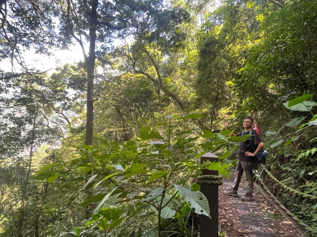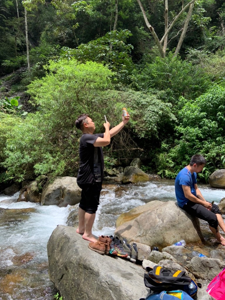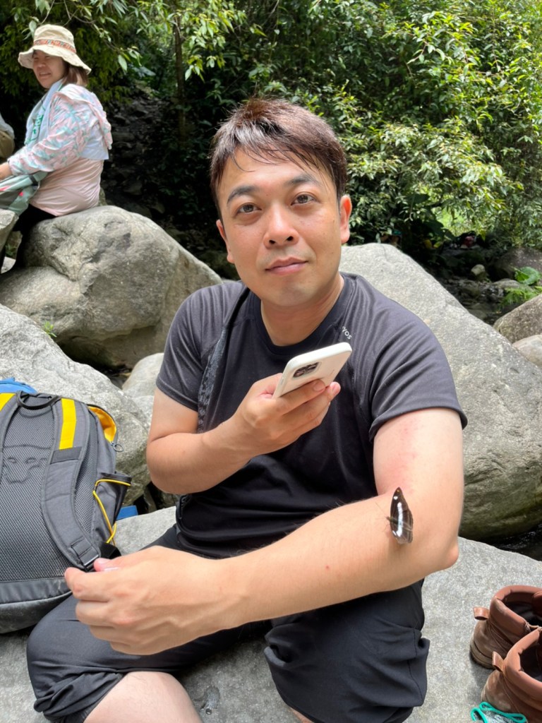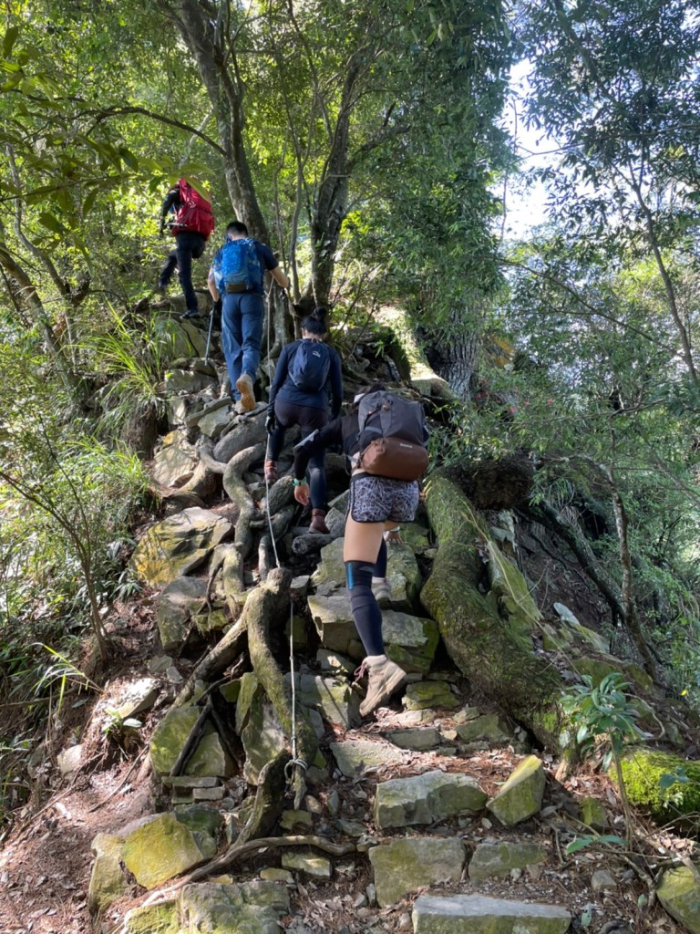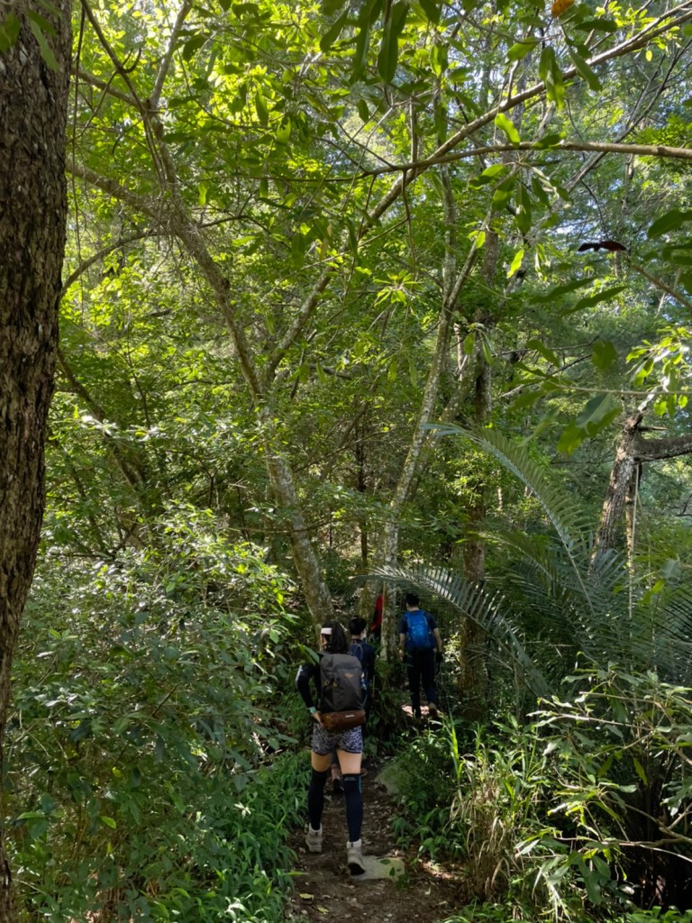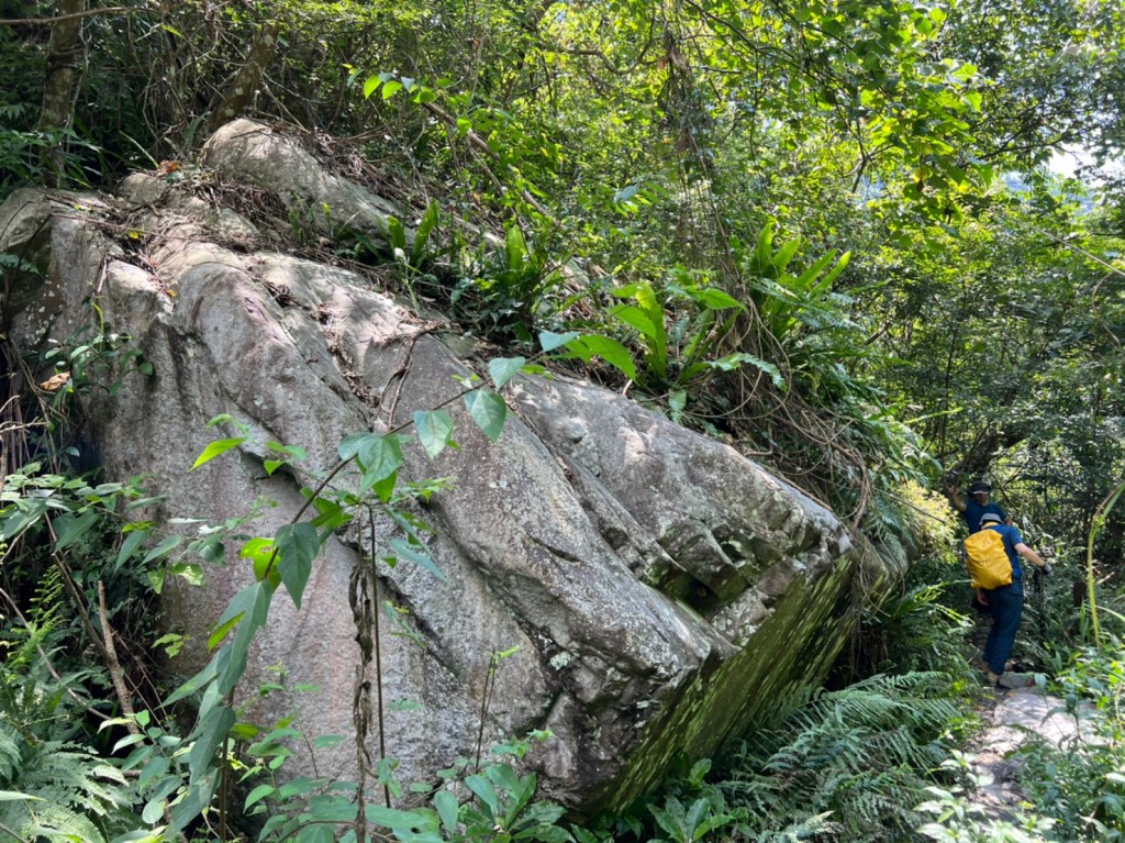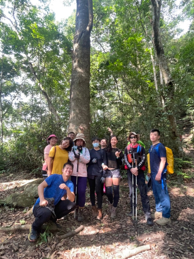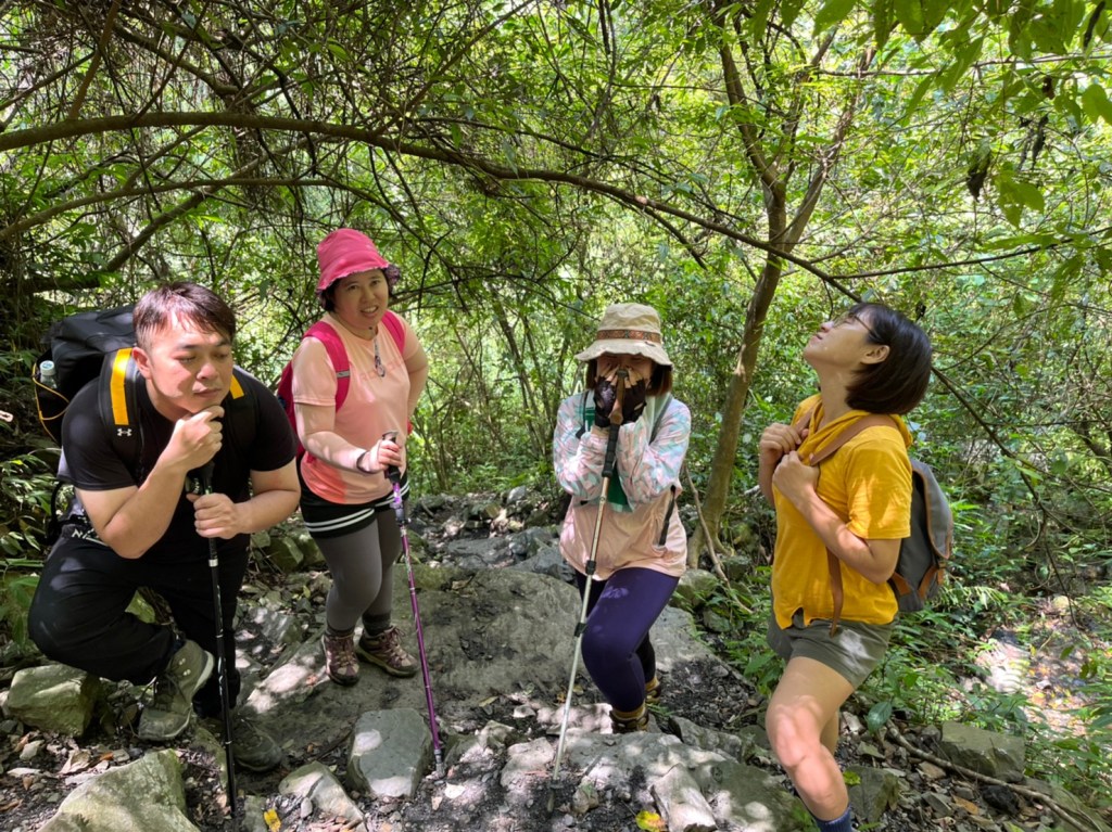 STH : 天氣熱爆了+白冷線一路陡上大腿炸裂+加上小名字跟小畢開了加速器一般的速度+三個月沒爬山,本團開團至今我第一次走到會想偷懶休息,也是第一次把水袋3000多CC的水全部喝光。雖說海拔不高林相變化不大,但還是見到不少巨木巨石展現出的力量美,沿途也有看到不少可以遠眺它山的觀景點,不過因為陡上路段,能夠偷懶休息的平坦地形並不多,藍天白雲好天氣也在悶熱的氣候下成為了無福消受的美。可能是帶了兩位加速師的加持,上到三角點的時間比預期的早,剛好可以讓大家研究打卡app的使用並消化超大量的拍照人群。不知道是不是因為蝴蝶谷瀑布的關係,山上的蝴蝶好多,在三角點也遇到一隻很漂亮的蝴蝶,可惜動作太大驚嚇到了蝴蝶,也更加深了買單眼+長焦鏡頭的念頭。俗話說,現在爬多高晚點就要下多深,一路向下的路段真的是考驗煞車技巧,辛苦了我的雙腿與雙肩。不過前往蝴蝶谷的路段有有因為潮濕與背陽的特性比較不那麼悶熱難受,有個山壁小水瀑那邊很涼爽是個不錯的畫面,可惜為了趕路沒多停留。蝴蝶谷高度的落差與水瀑的寬度比例很好看,除了空拍也很適合合影,水很清澈冰涼,還可以看到不少魚在水裡閃躲著人類大軍,可惜的是平坦腹地不多,但瀑布區有很多蝴蝶飛來飛去,還會停留在人們的身上,貢獻了不少記憶體的空間。來到瀑布區的人都會想跟瀑布合影,但真的會涉水靠近的卻不多,想想,我好像真的很常會把人群帶到更升入的地方去真是對不起山神阿,不過看在此次還帶了泳裝美女,山神因該是會原諒我的。