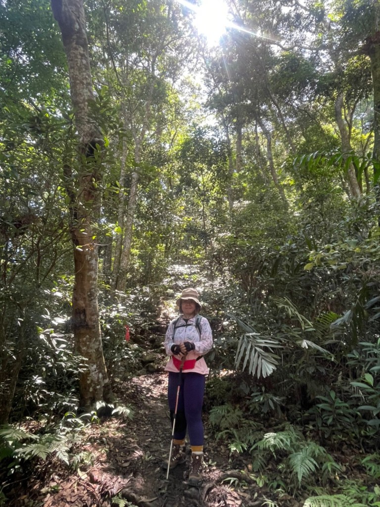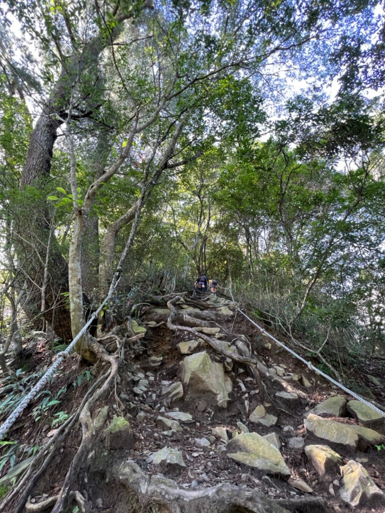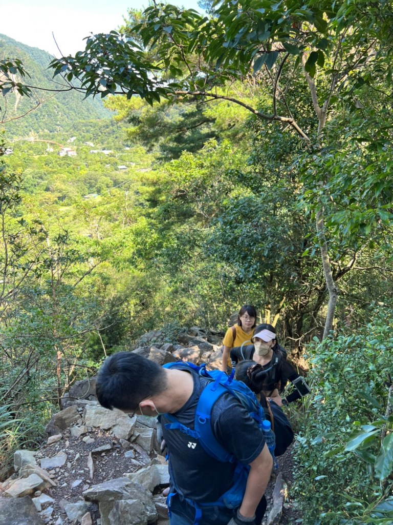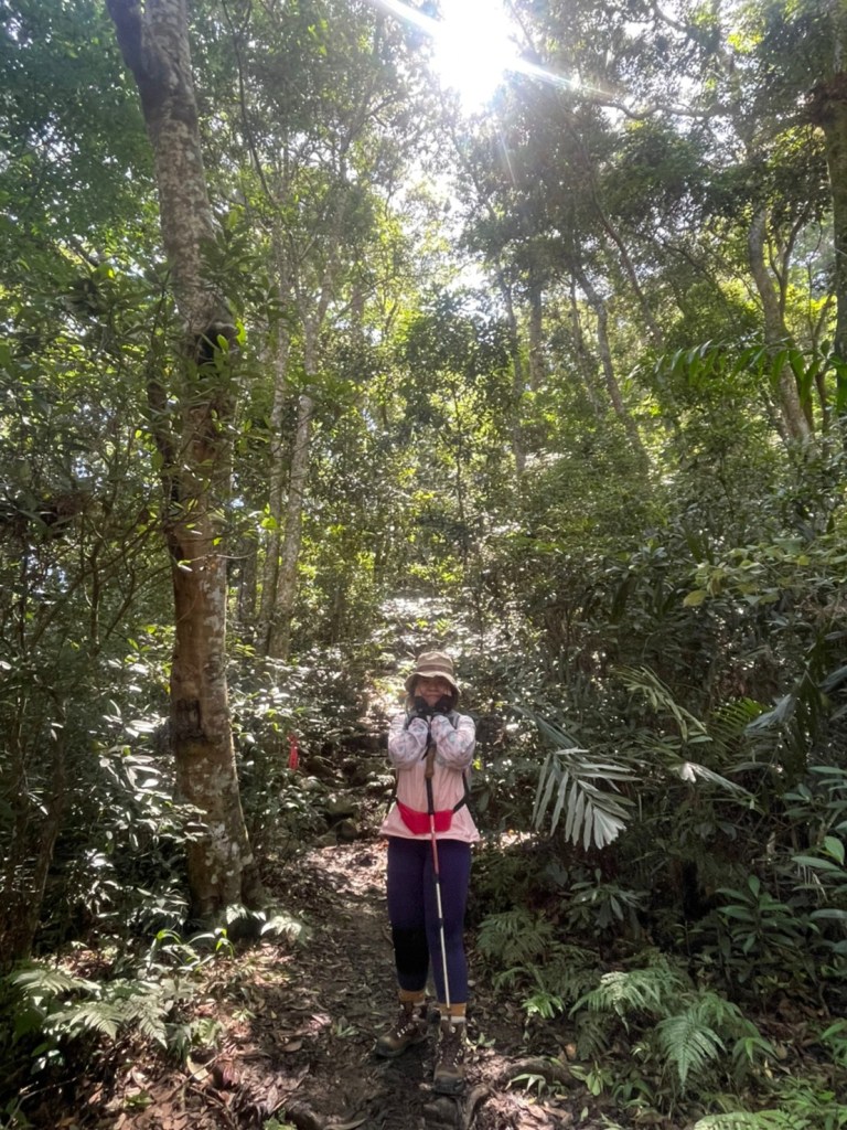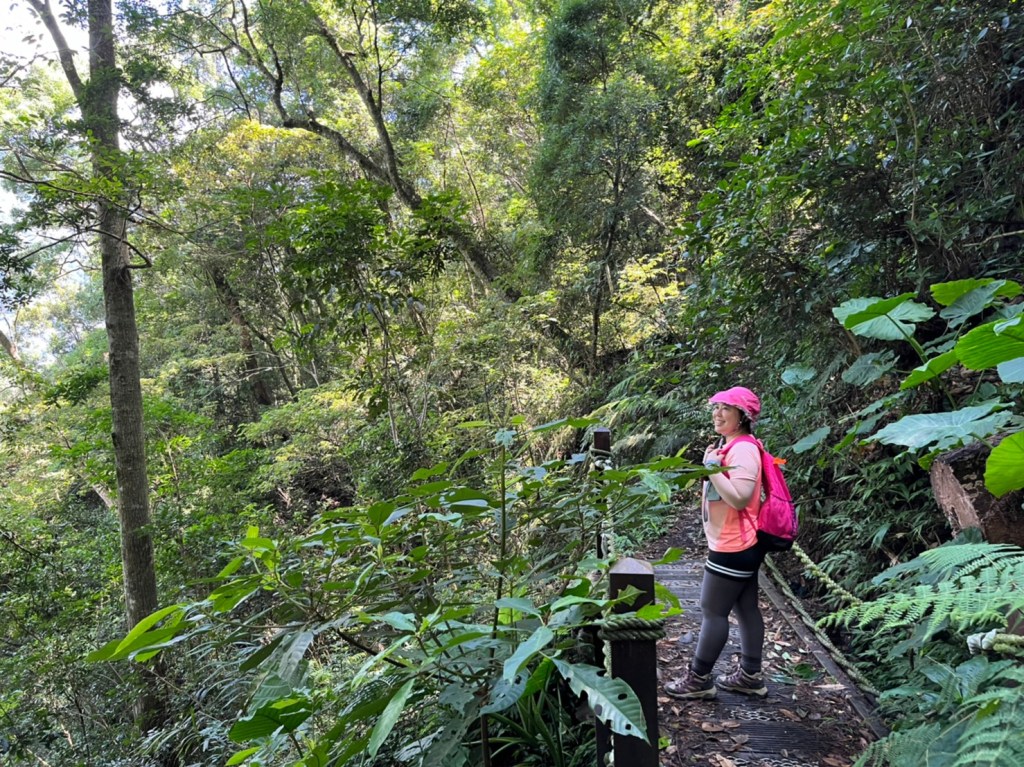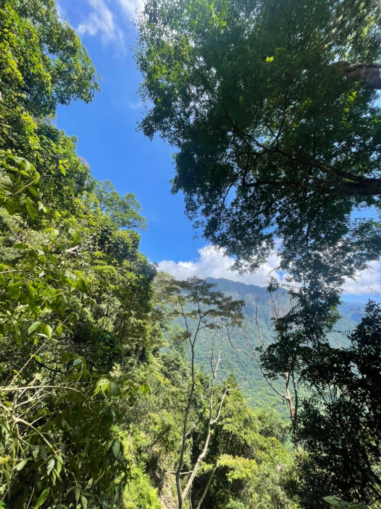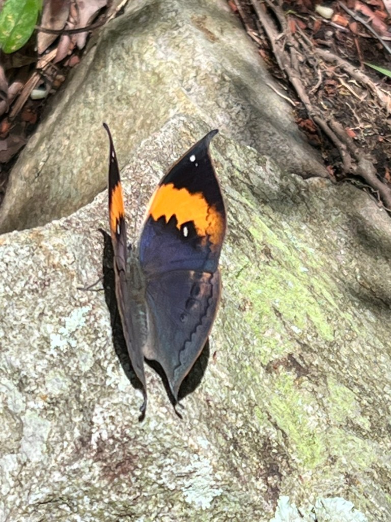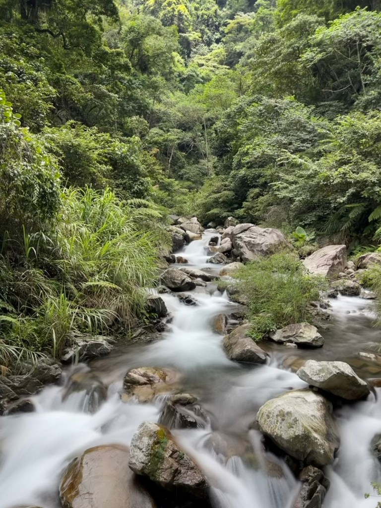 STH : 天氣熱爆了+白冷線一路陡上大腿炸裂+加上小名字跟小畢開了加速器一般的速度+三個月沒爬山,本團開團至今我第一次走到會想偷懶休息,也是第一次把水袋3000多CC的水全部喝光。雖說海拔不高林相變化不大,但還是見到不少巨木巨石展現出的力量美,沿途也有看到不少可以遠眺它山的觀景點,不過因為陡上路段,能夠偷懶休息的平坦地形並不多,藍天白雲好天氣也在悶熱的氣候下成為了無福消受的美。可能是帶了兩位加速師的加持,上到三角點的時間比預期的早,剛好可以讓大家研究打卡app的使用並消化超大量的拍照人群。不知道是不是因為蝴蝶谷瀑布的關係,山上的蝴蝶好多,在三角點也遇到一隻很漂亮的蝴蝶,可惜動作太大驚嚇到了蝴蝶,也更加深了買單眼+長焦鏡頭的念頭。俗話說,現在爬多高晚點就要下多深,一路向下的路段真的是考驗煞車技巧,辛苦了我的雙腿與雙肩。不過前往蝴蝶谷的路段有有因為潮濕與背陽的特性比較不那麼悶熱難受,有個山壁小水瀑那邊很涼爽是個不錯的畫面,可惜為了趕路沒多停留。蝴蝶谷高度的落差與水瀑的寬度比例很好看,除了空拍也很適合合影,水很清澈冰涼,還可以看到不少魚在水裡閃躲著人類大軍,可惜的是平坦腹地不多,但瀑布區有很多蝴蝶飛來飛去,還會停留在人們的身上,貢獻了不少記憶體的空間。來到瀑布區的人都會想跟瀑布合影,但真的會涉水靠近的卻不多,想想,我好像真的很常會把人群帶到更升入的地方去真是對不起山神阿,不過看在此次還帶了泳裝美女,山神因該是會原諒我的。