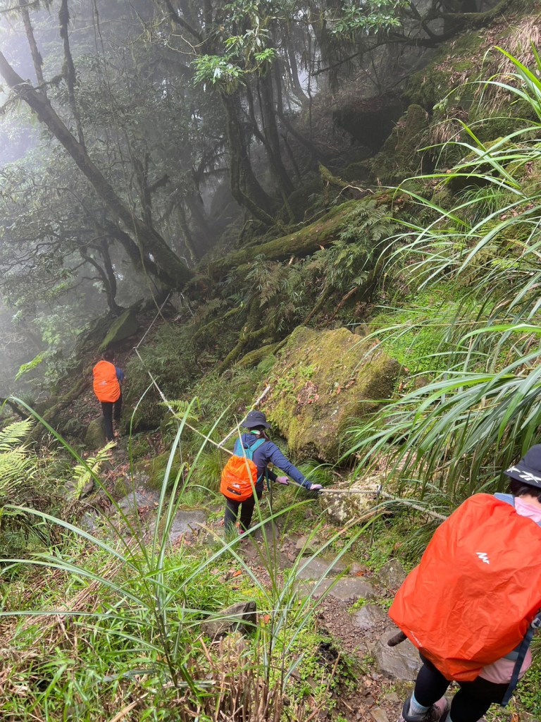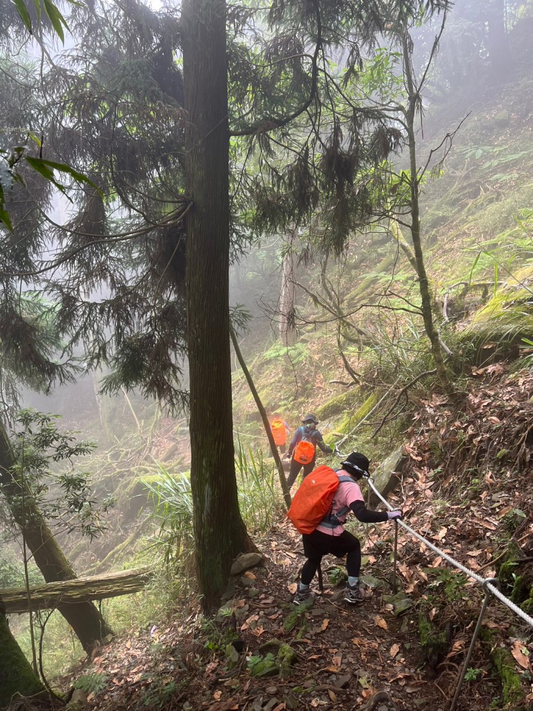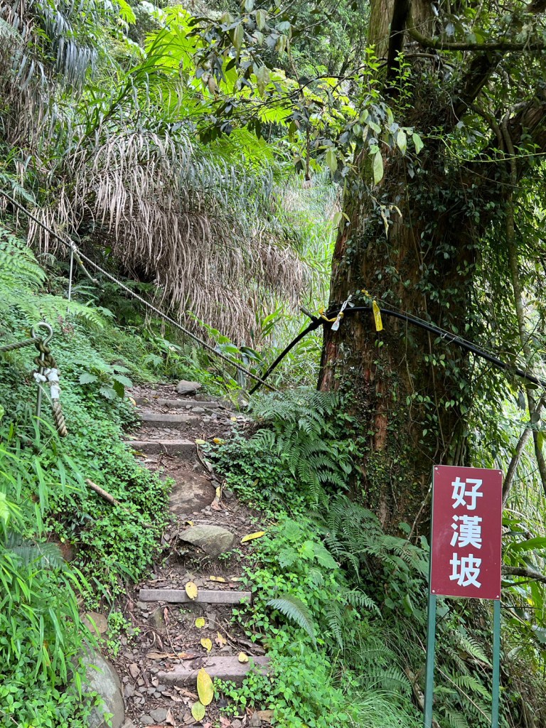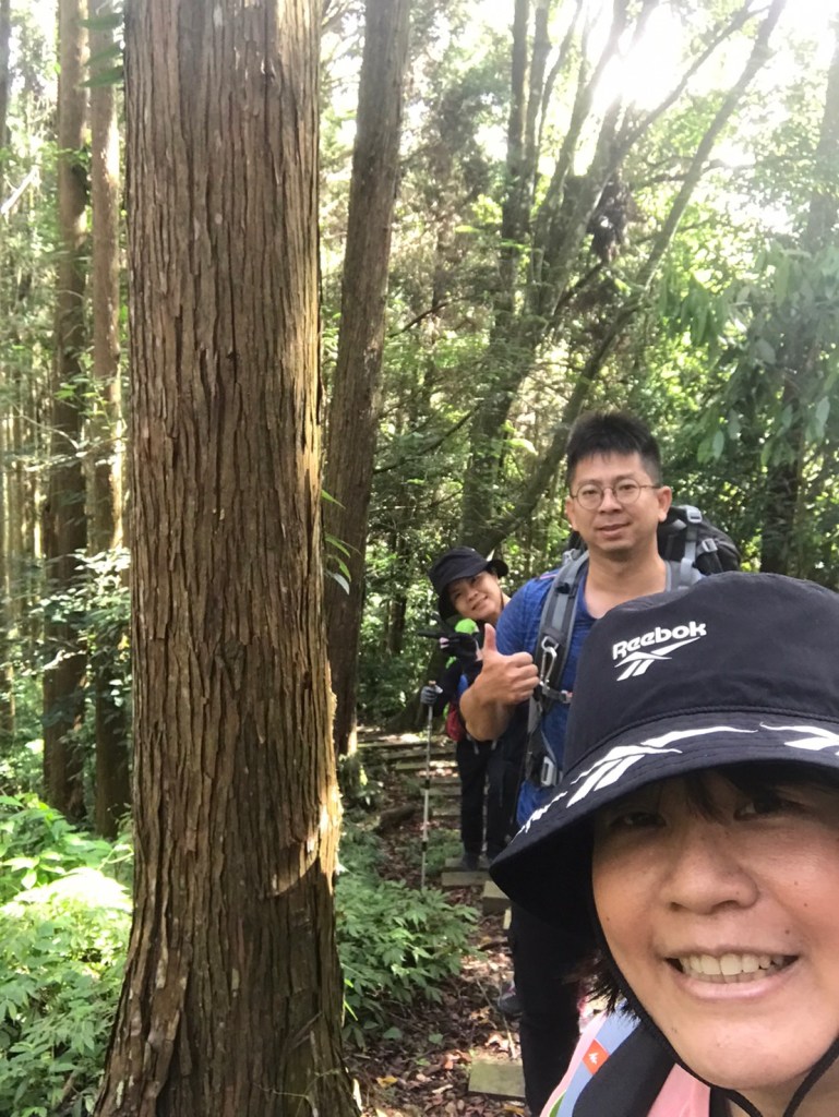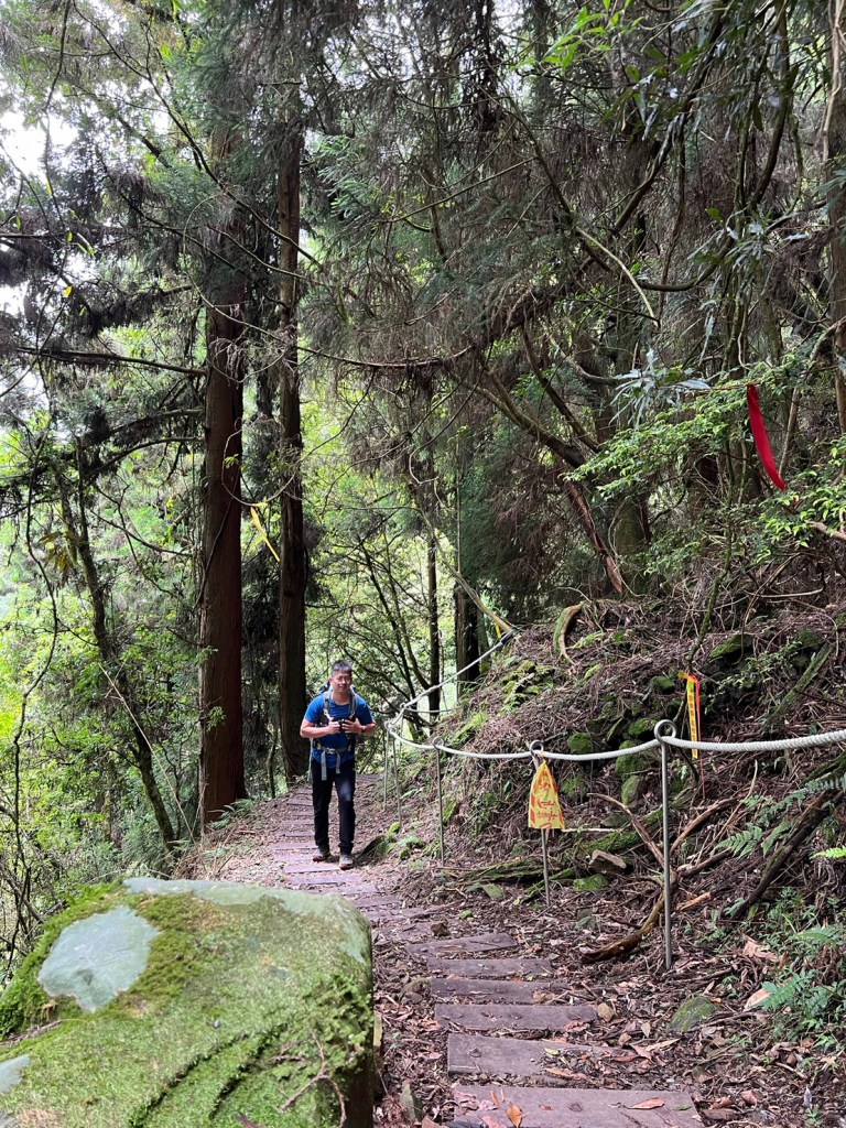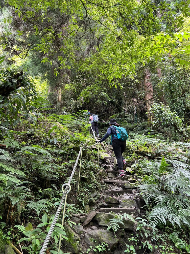 STH : 務必要搭乘街播車,前段路程不短,斜度也很大。前段的階梯不算難走,路也夠寬,走在柳杉林之間的感覺很舒服,不過因為海拔尚低,所以會比較熱。前段路線整體來說不太困難,就時因為前起天有下過雨,地板溼滑,以及一堆的咬人貓。最難走的好漢坡真的不容易,坡度、路窄、地滑、咬人貓。直到上到鐵路之後才好走,這趟非常好運的到了車站才下雨,因為下雨、海拔、與流汗,這次午餐蠻冷的。