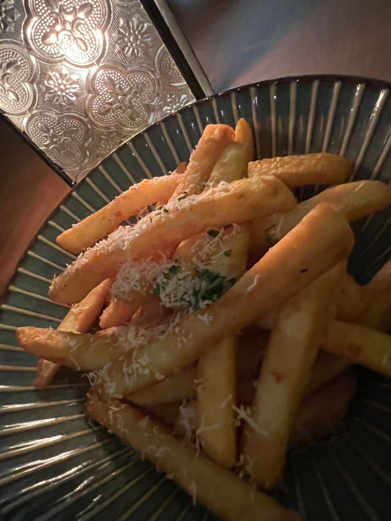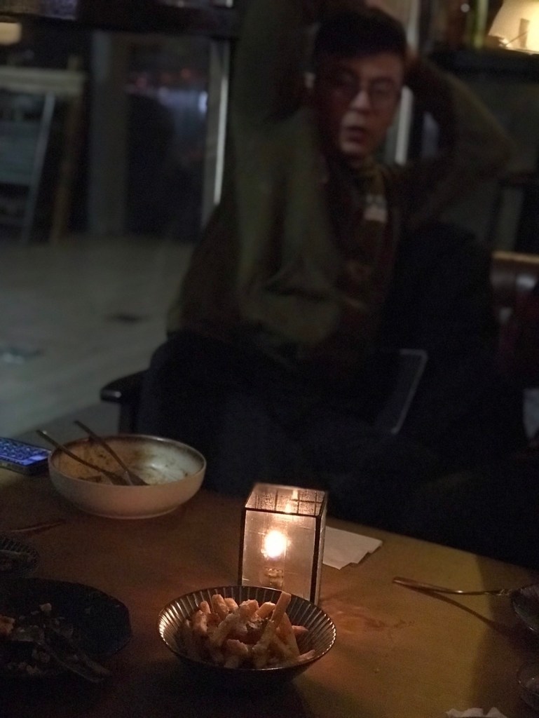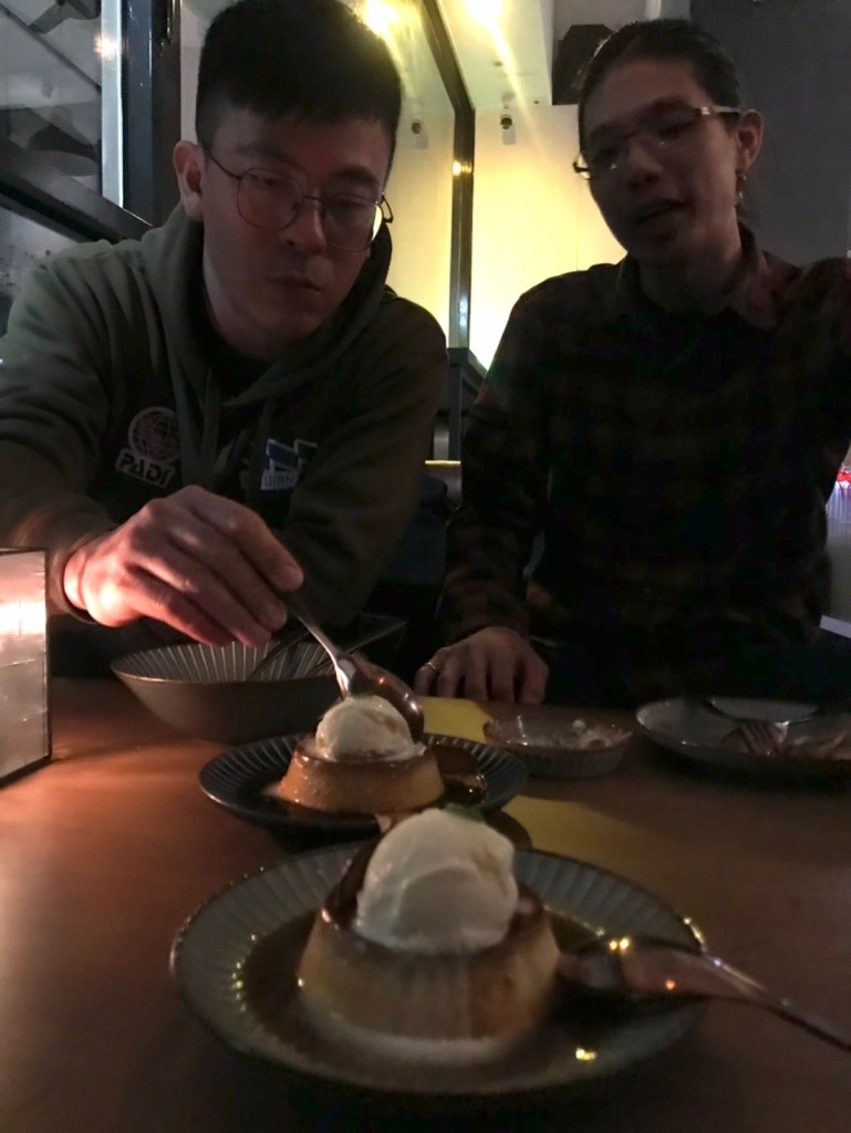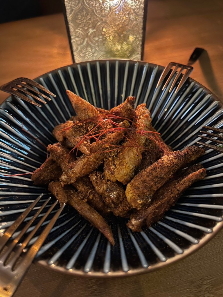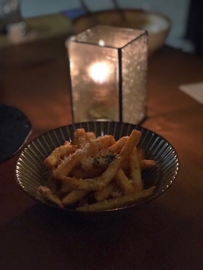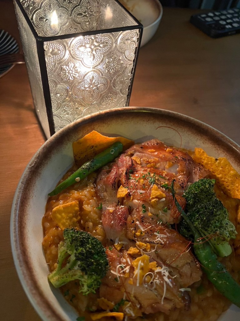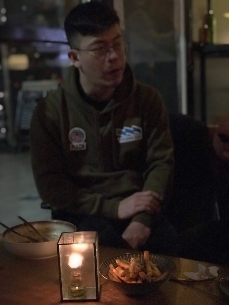 STH : 剛好因為鼻塞喉嚨痛,沒能專心品嘗。但前菜的香辣油封蒜蝦的味道不錯,味道適中,不會搶戲,剛好可以襯托蝦肉的味道。金沙玉米花菜的味道也不錯,外面鹹鹹的,裡面玉米甜甜的,味道很有層次,是個不錯的選擇。可惜松露薯條就是單純的薯條搭配松露醬料而已,沒有讓我有所驚豔。香料雞翅考得很老很脆,是一種有趣的吃法,但我還是比較喜歡吃多汁的肉。我的主菜花雕雞燉飯,分量對我而言少了一些,花雕雞的味道也不錯,肉咀嚼起來嫩嫩的。整體環境能讓人放鬆,是個下班後三五好友聚餐的好選擇。