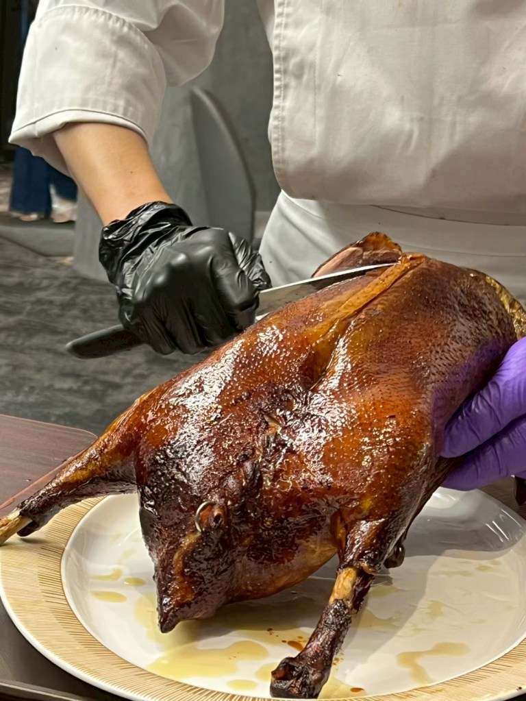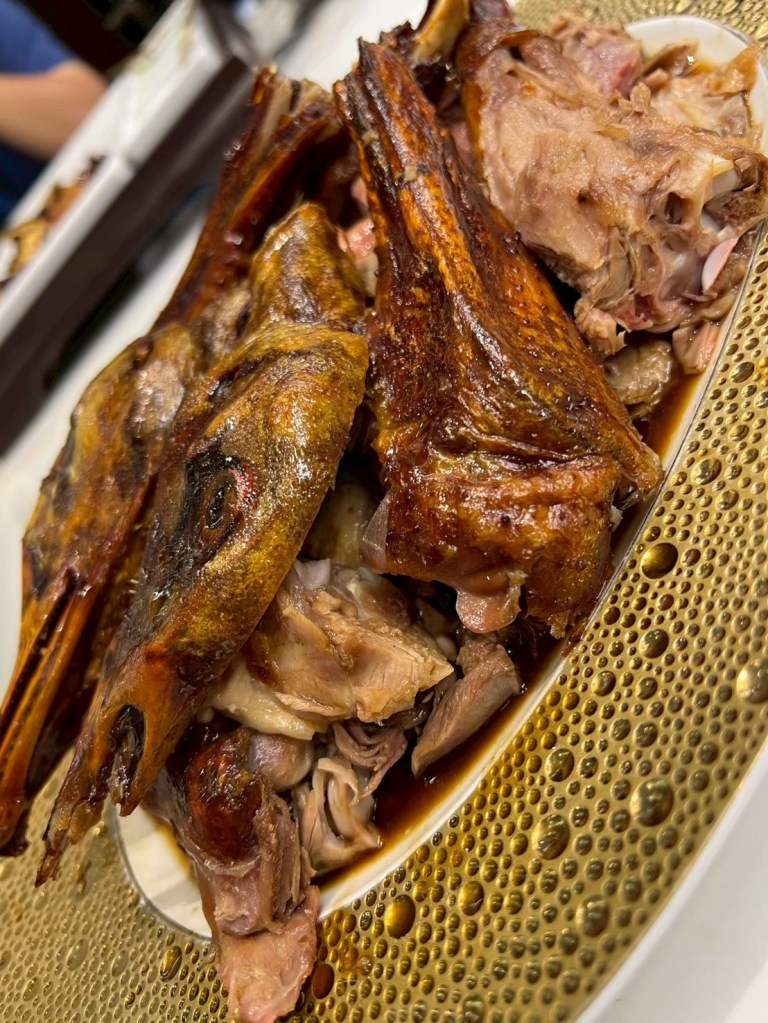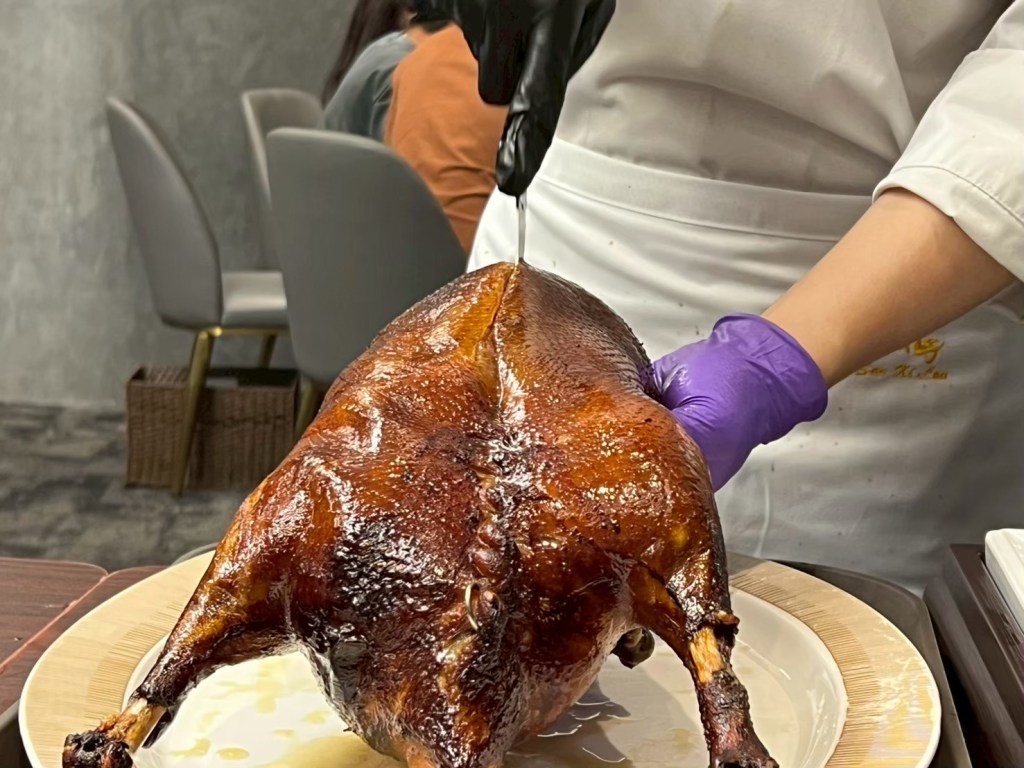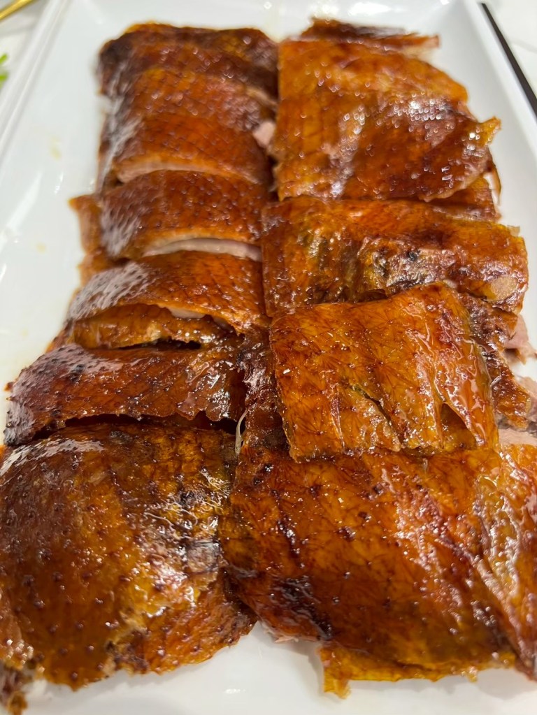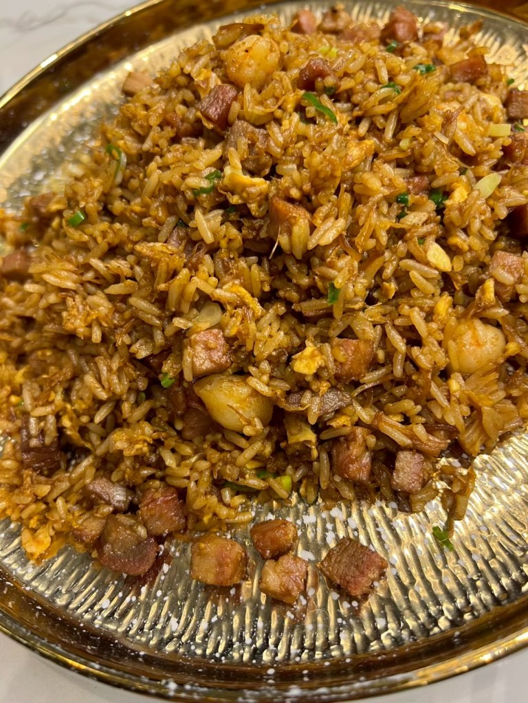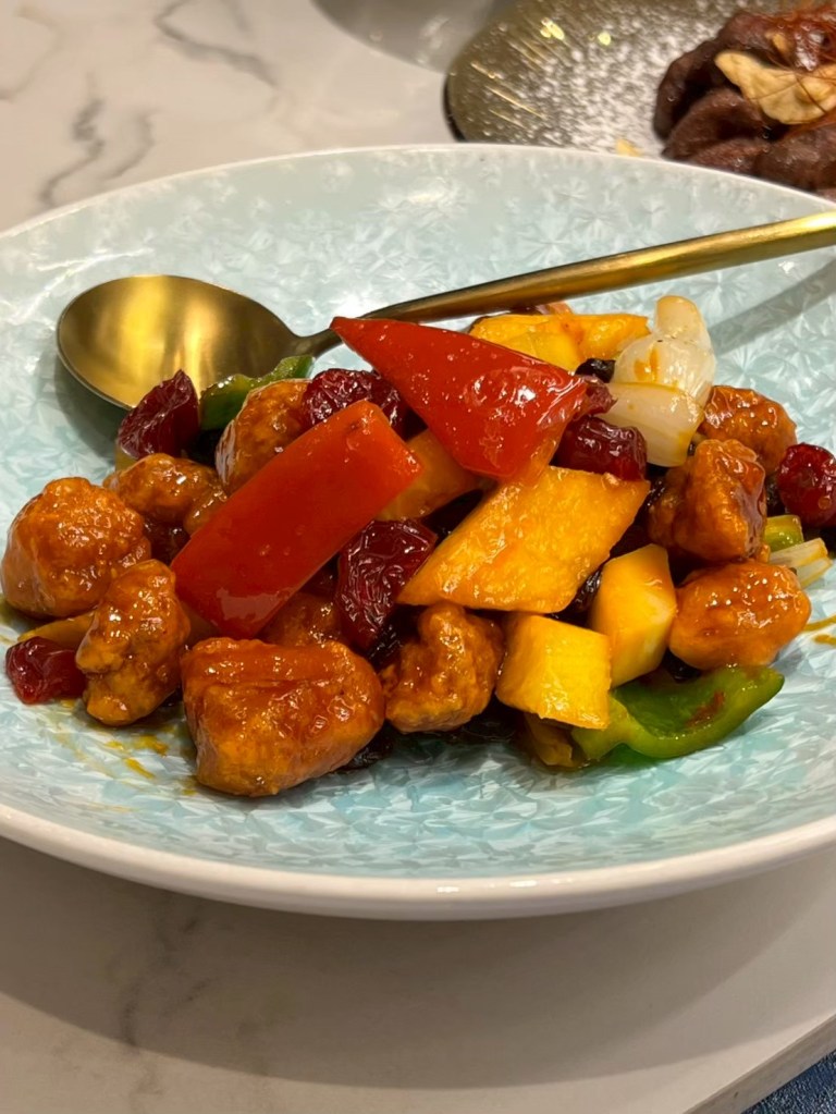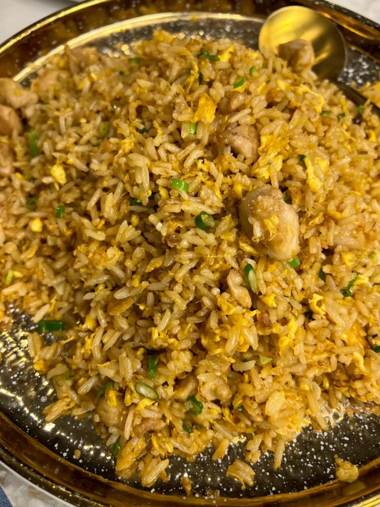 20250606 三希樓 推薦人 : 17 STH:難得久違的高消費晚餐,片皮鵝好吃,表皮脆、肉質不乾柴,青椒清香魚味道不錯,但是對我而言偏辣,但湯頭是真的好喝,其中我個人喜歡的是招牌咕嚕肉,甜甜的很合台南人的胃口,炒飯用的是日本越光米,吃起來口感很好。
