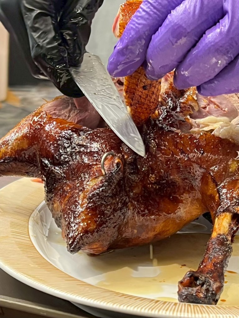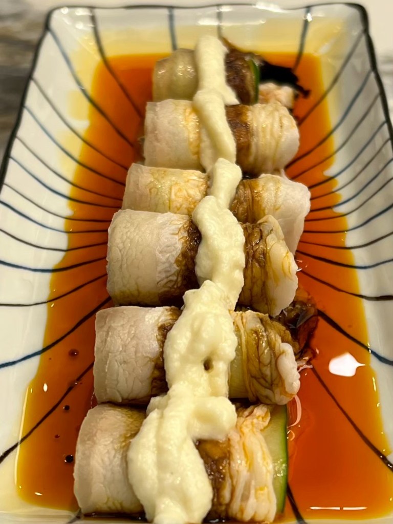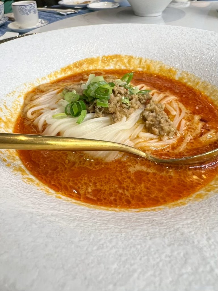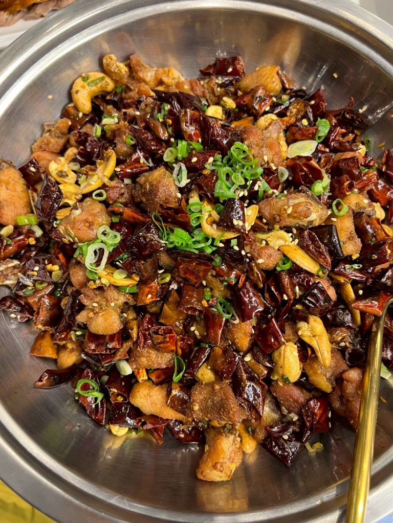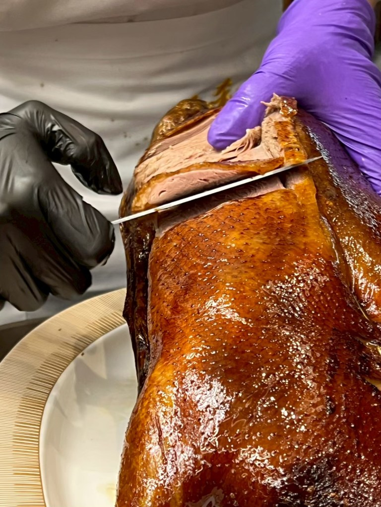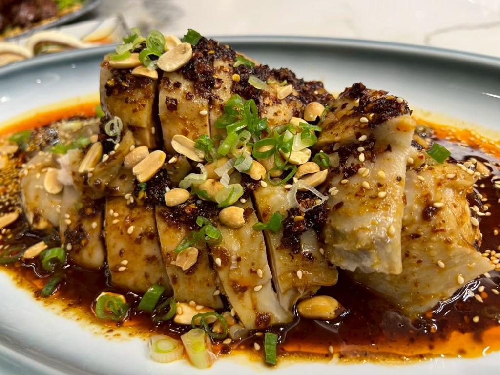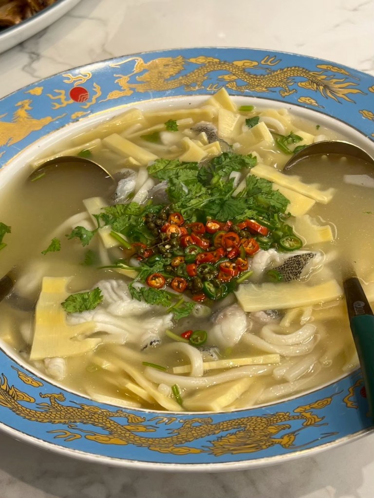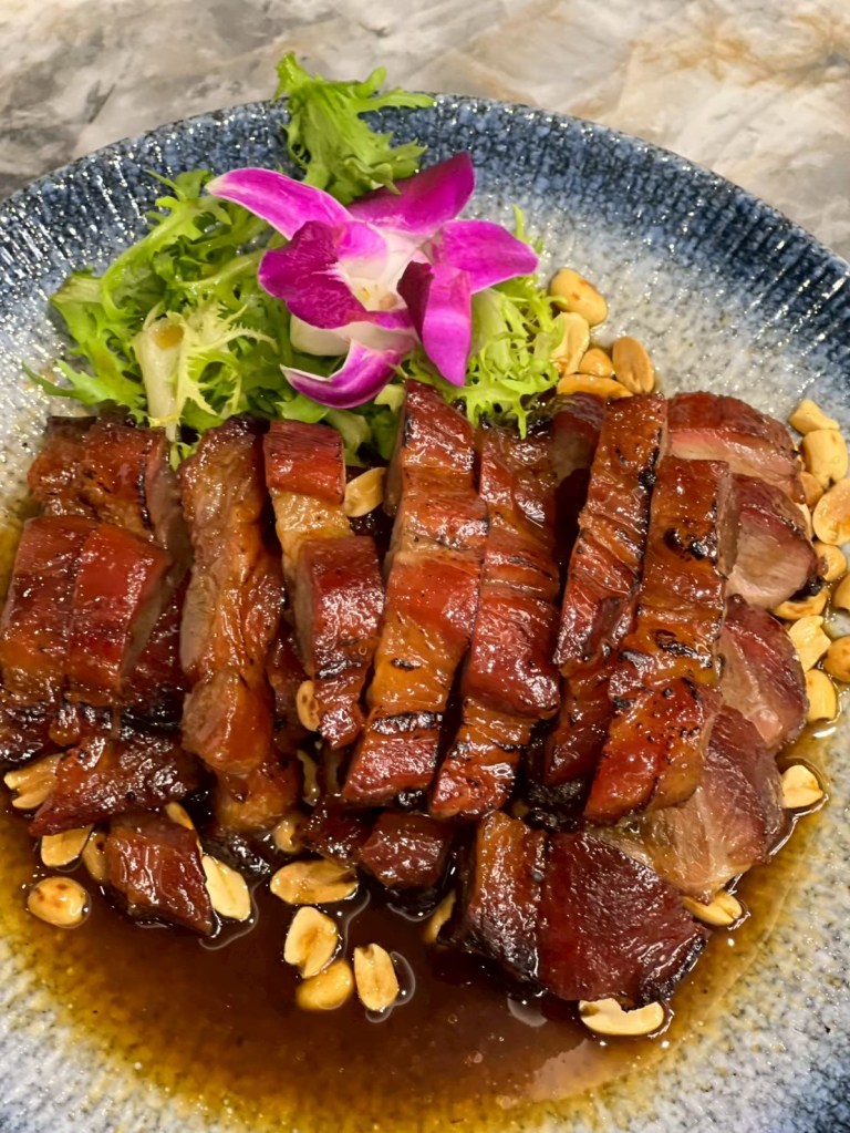 20250606 三希樓 推薦人 : 17 STH:難得久違的高消費晚餐,片皮鵝好吃,表皮脆、肉質不乾柴,青椒清香魚味道不錯,但是對我而言偏辣,但湯頭是真的好喝,其中我個人喜歡的是招牌咕嚕肉,甜甜的很合台南人的胃口,炒飯用的是日本越光米,吃起來口感很好。
