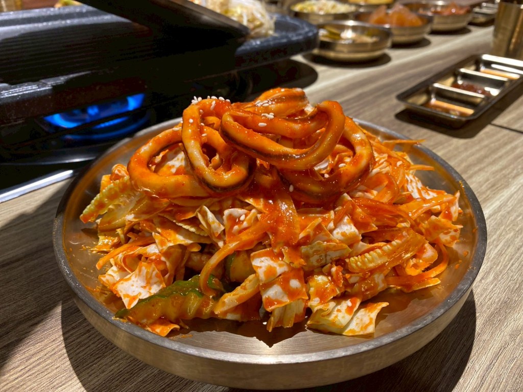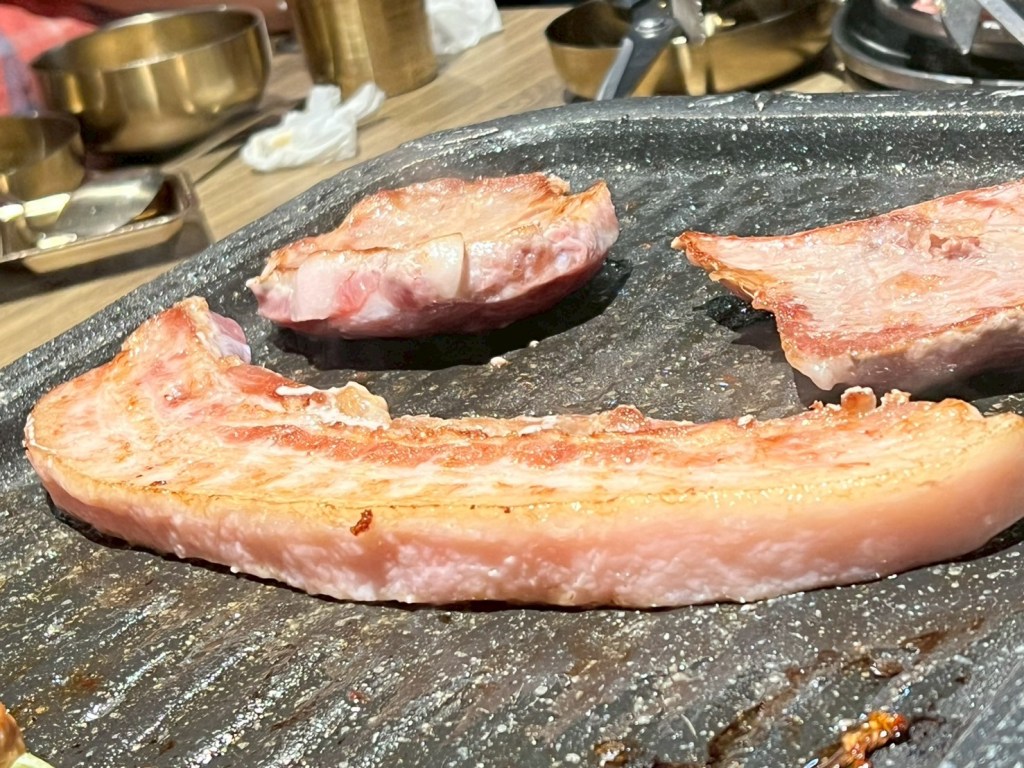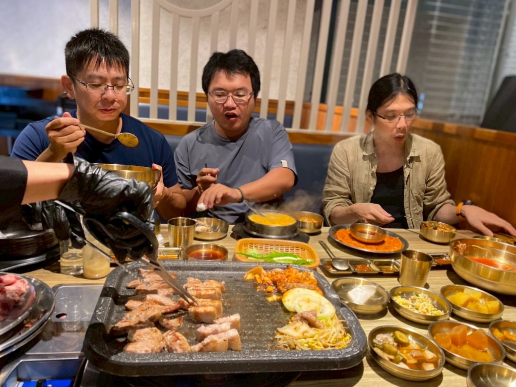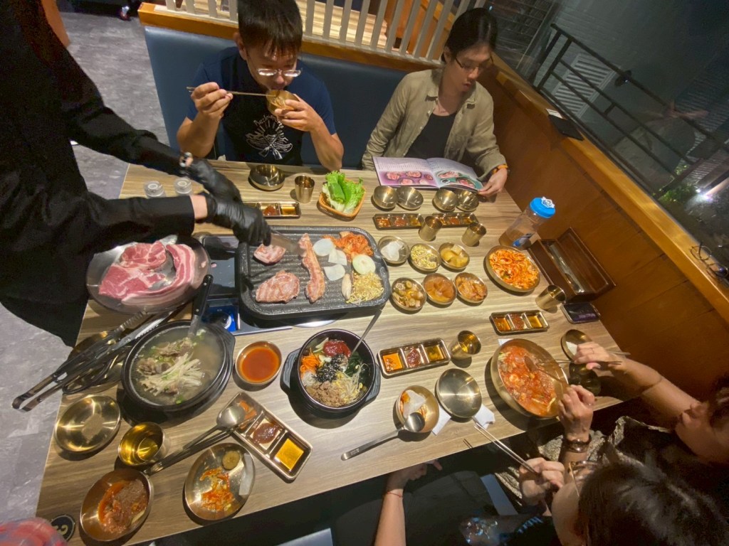 STH:再次品嚐韓式烤肉,跟之前隻的餐廳一樣都是店員幫我們烤的,缺點是有點尷尬。我點的是伊比利豬,Q談有嚼勁的口感很不錯。包肉的青菜與搭配吃的泡菜可加菜,芝麻葉的特殊味道還是我比較喜歡的包肉菜。可惜我比較習歡涼一點的泡菜,搭配偏酸微辣的口感會比較好,但水赤床的泡菜是放在烤盤上烤過,所以只有包肉菜是室溫,整體溫度偏高,對我來說比較可惜。