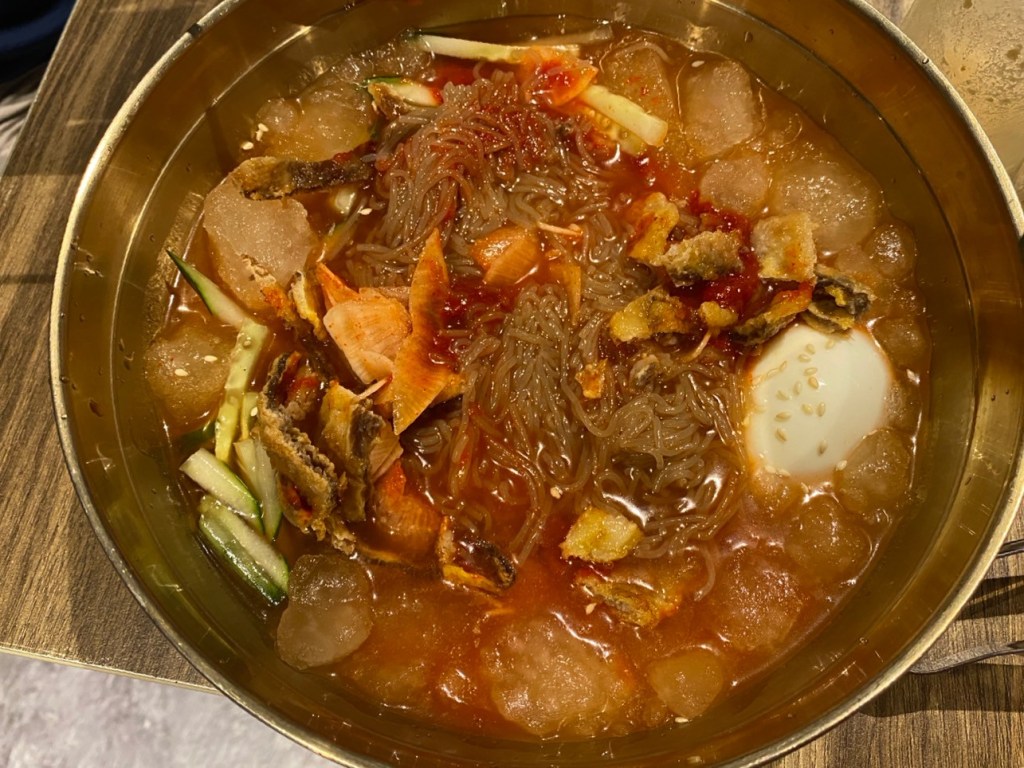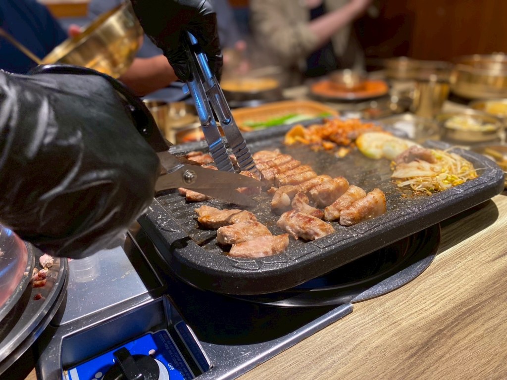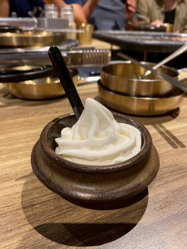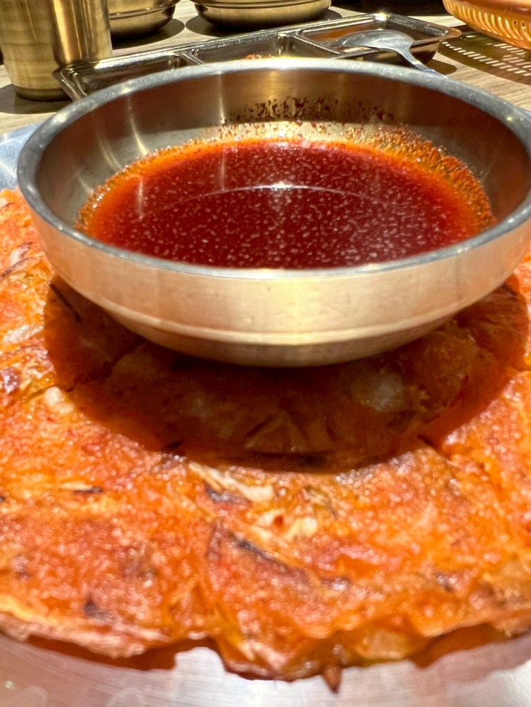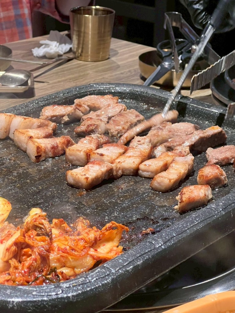STH:再次品嚐韓式烤肉,跟之前隻的餐廳一樣都是店員幫我們烤的,缺點是有點尷尬。我點的是伊比利豬,Q談有嚼勁的口感很不錯。包肉的青菜與搭配吃的泡菜可加菜,芝麻葉的特殊味道還是我比較喜歡的包肉菜。可惜我比較習歡涼一點的泡菜,搭配偏酸微辣的口感會比較好,但水赤床的泡菜是放在烤盤上烤過,所以只有包肉菜是室溫,整體溫度偏高,對我來說比較可惜。